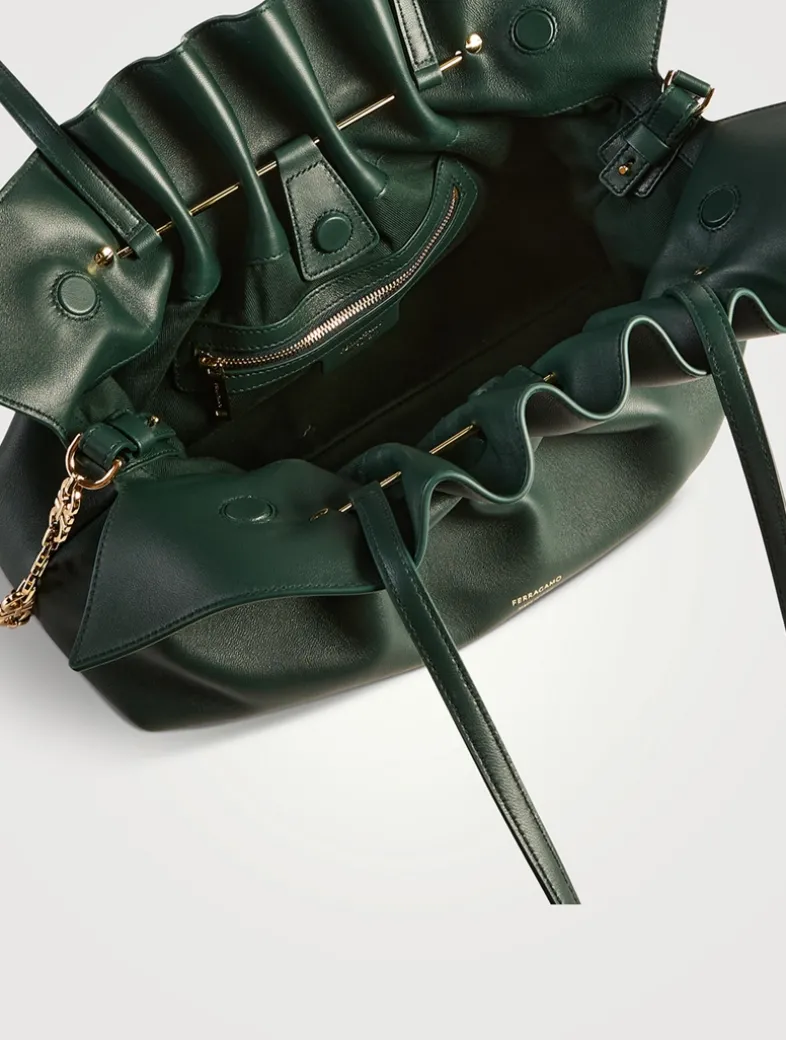 This shoulder bag reinterprets an archive design with a modern edge. The clean-cut silhouette is enhanced by soft nappa leather, gathered at the top with a Gancio pin for a bold yet effortless look. A zippered pocket inside.