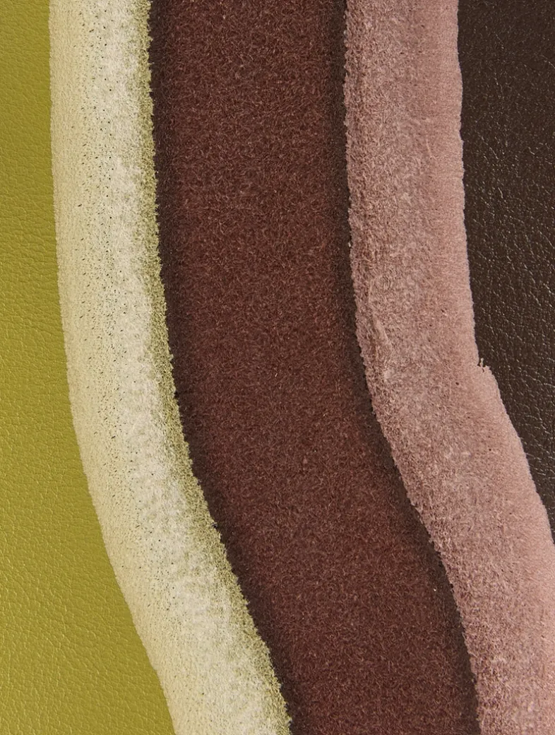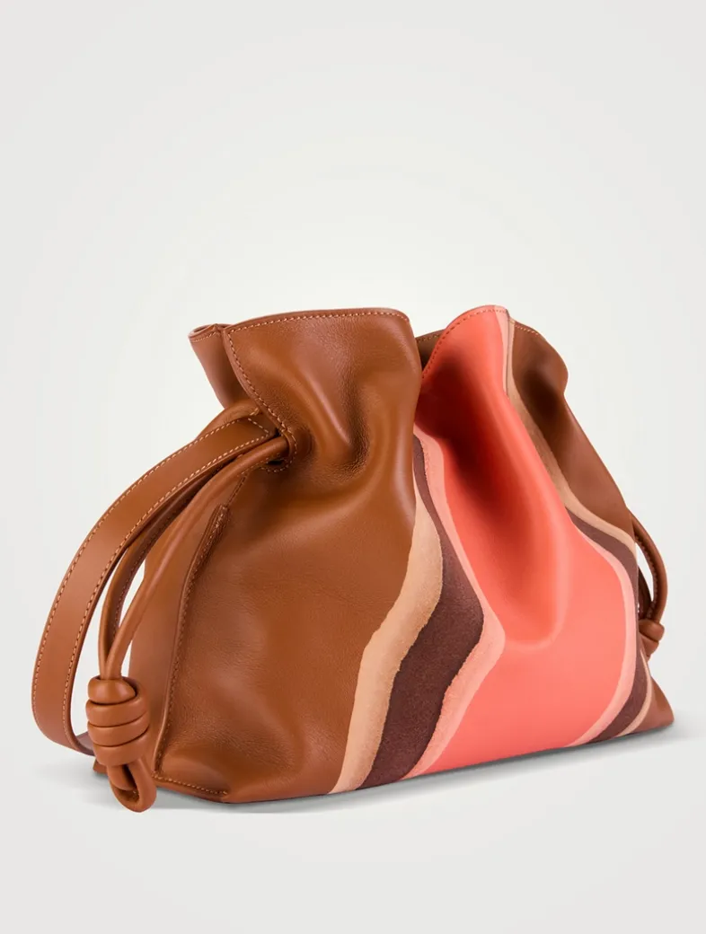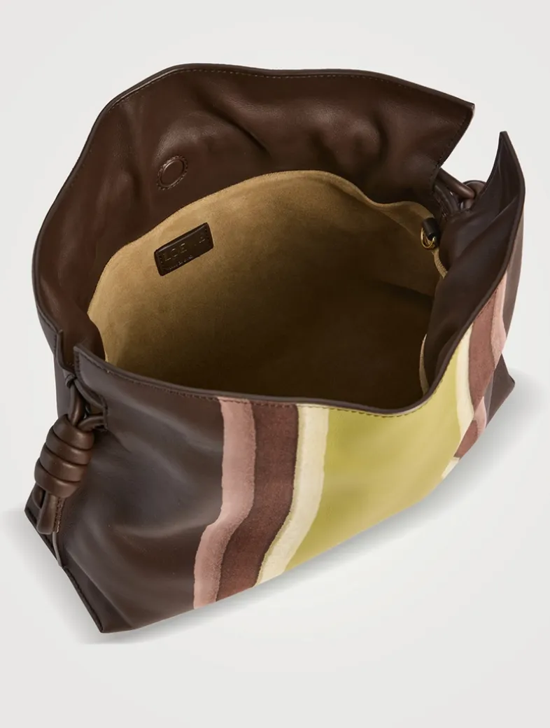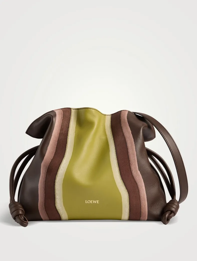 The Flamenco Landscape is a soft and slouchy bag with a cinched closure and historical knot drawstrings. This medium version is crafted in nappa calfskin and suede, layered, compressed and skived to create a one-of-a-kind effect.
