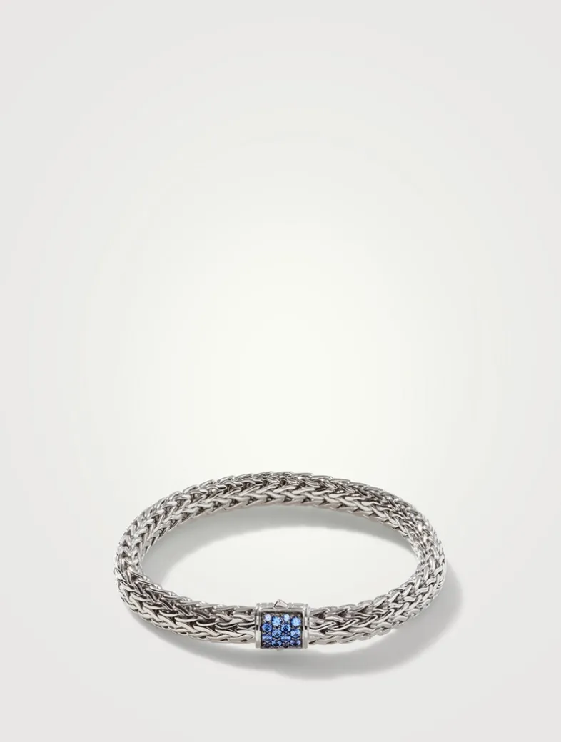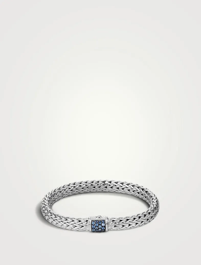 Woven by hand in sterling silver, the heritage Icon Chain is the foundational expression of John Hardy artisanship. This one features a sparkling blue sapphire clasp.