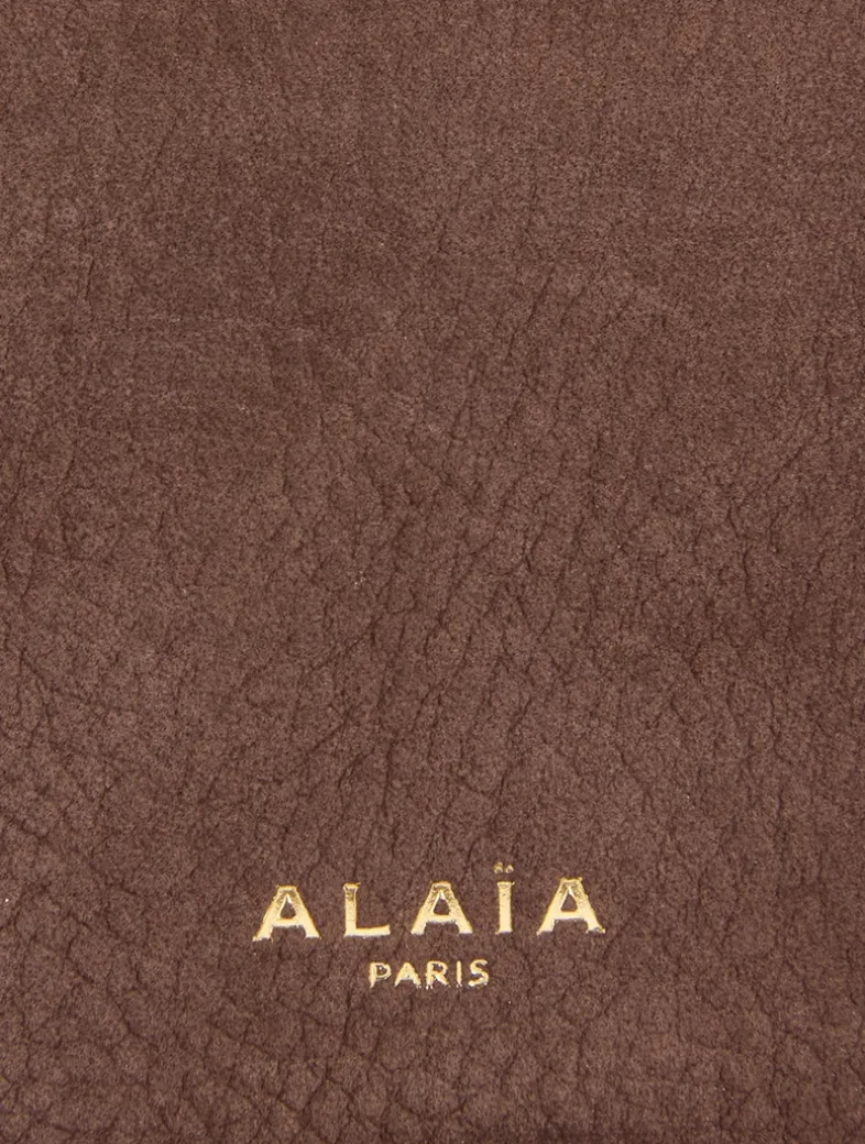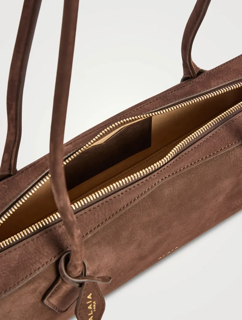 Designed with an elongated shape, this nubuck leather bag is topped with a set of tubular handles with two decorative ties. It has a double zip fastening and a small removable mirror in the inside pocket.