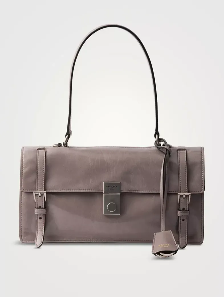 Leather handle, drop 20 cm Metal hardware Engraved lettering logo on clasp Flap closure with push-lock clasp Nappa leather interior with two compartments and two pockets, including one with zipper