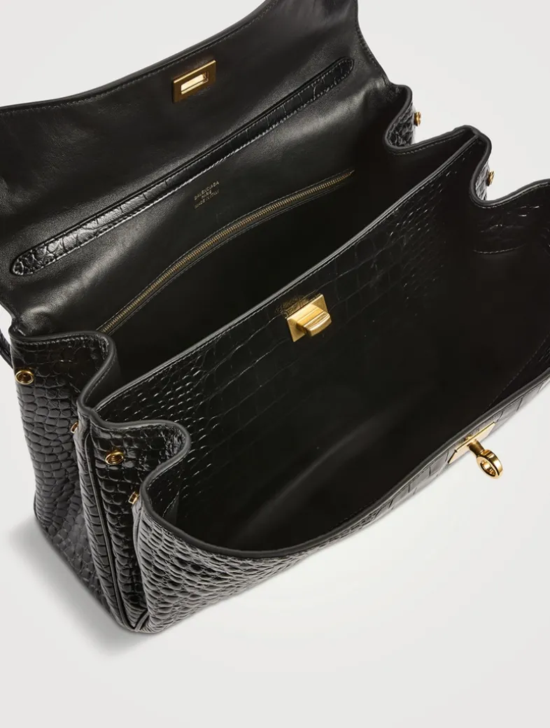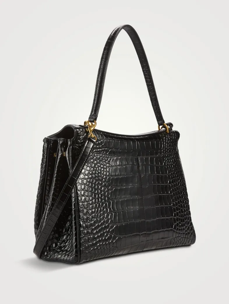 A croco-stamped leather construction and side snaps enhances the slouchy shape of this bag. Roomy enough for you daily essentials, the satchel features one main compartment, one inner zipped pocket, and two flat pockets at the back.