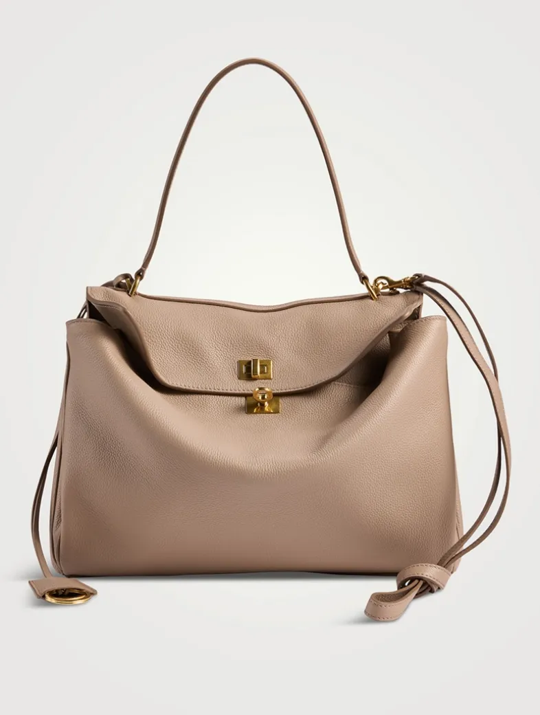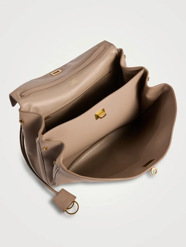 A buttery leather construction and side snaps enhances the slouchy shape of this bag. Roomy enough for you daily essentials, the satchel features one main compartment, one inner zipped pocket, and two flat pockets at the back.