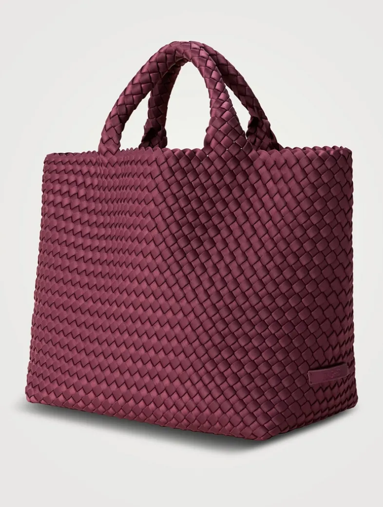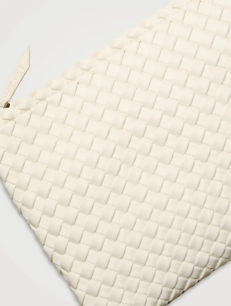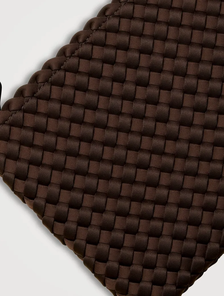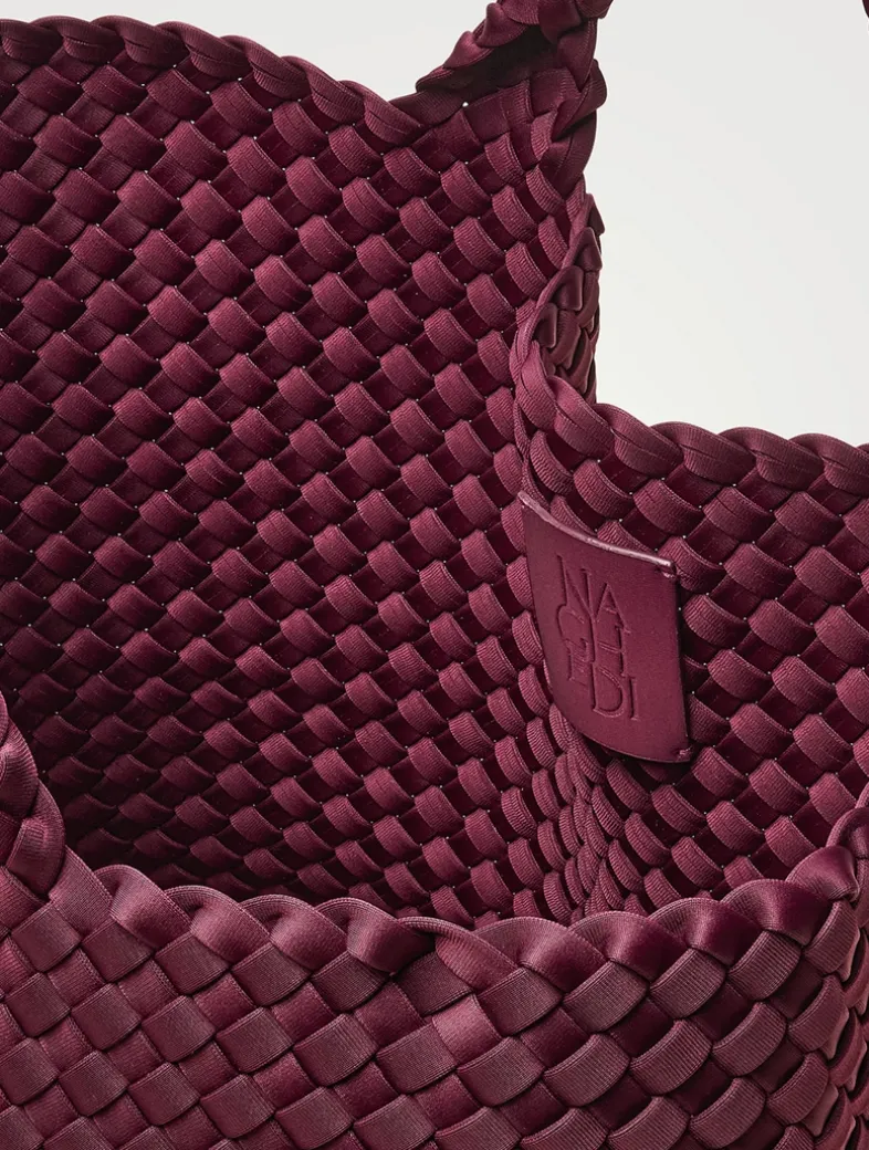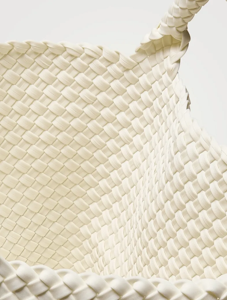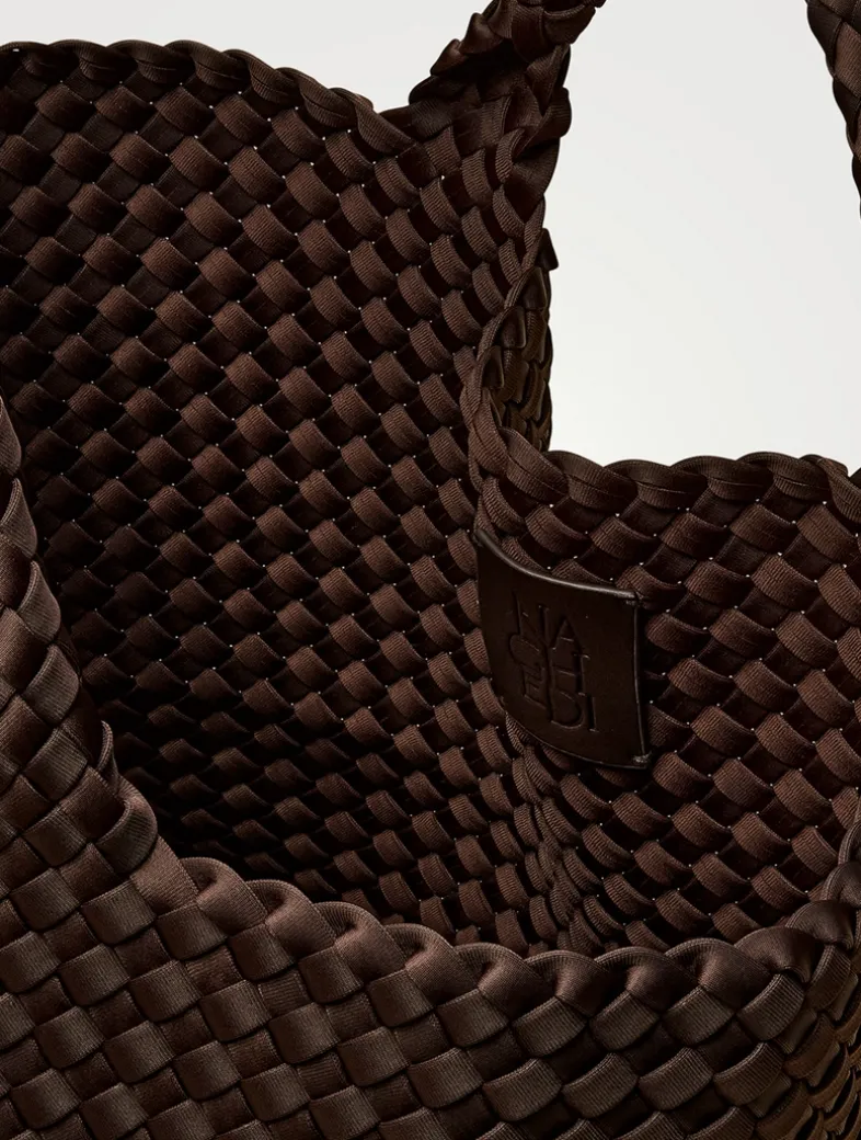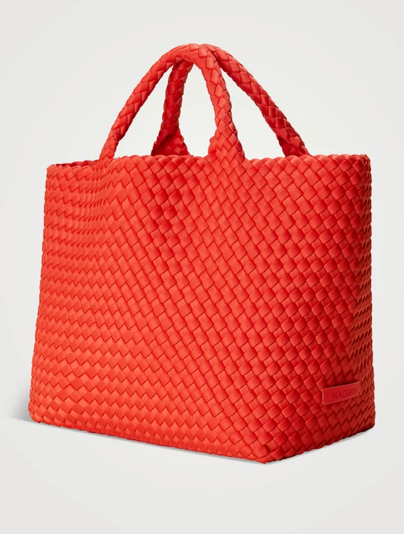 The very first NAGHEDI design and a best-selling classic. Handwoven from strips of neoprene, the St. Barths Tote is durable and timeless, made to be worn season after season. Matching woven zippered pouch included. Handles fit over the shoulder and are intentionally designed slightly shorter; they will gently stretch to the perfect length with wear.