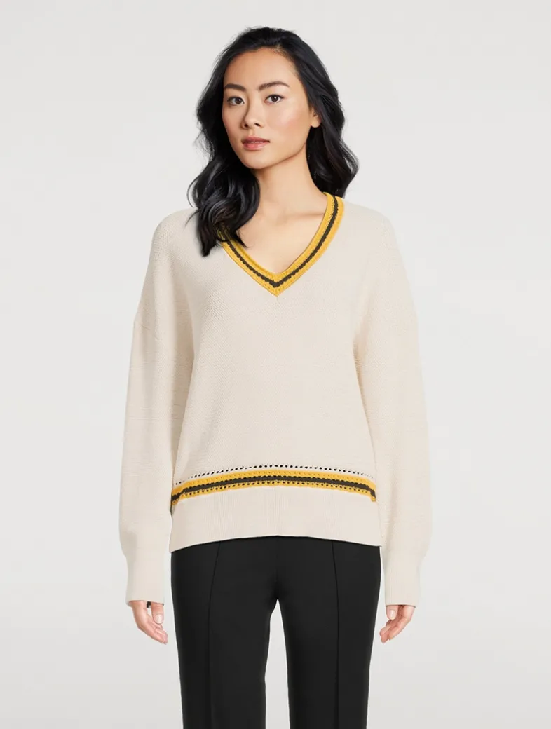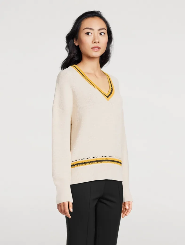 Crafted from a lightweight yarn infused with breathable cotton and viscose, this oversized take on the iconic cricket sweater is all about rich texture, from its open-knit body to striped crochet trims.