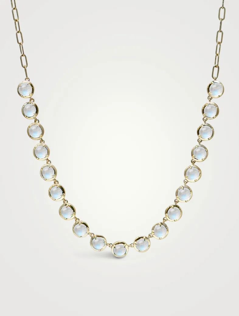 Round gemstones in a classic prong setting are fastened with a paper clip chain. This princess-inspired necklace is a twist on a classic style and adds sparkle to any evening look.