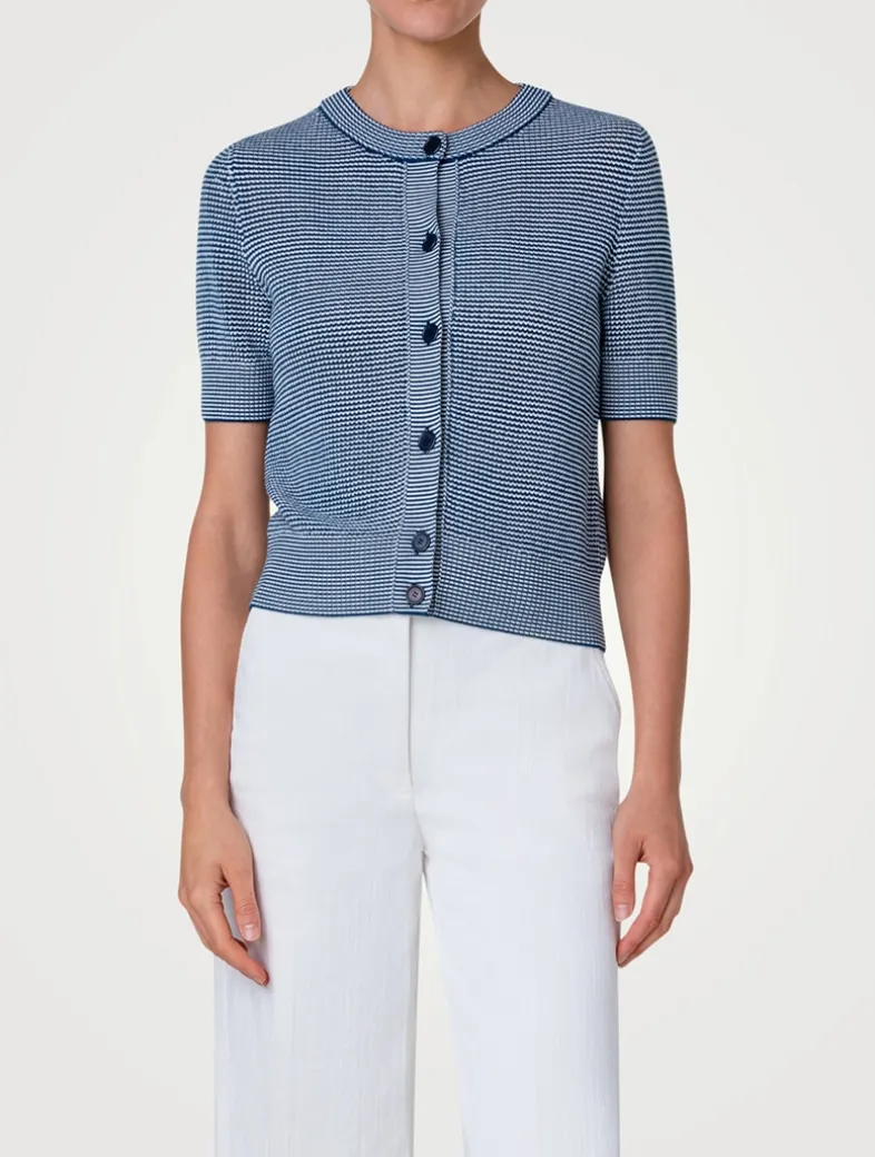 Knit from Akris Punto’s signature mesh stitch, this virgin wool cardi has a textured finish. It has a crew neckline and short sleeves finished with ribbed trim.