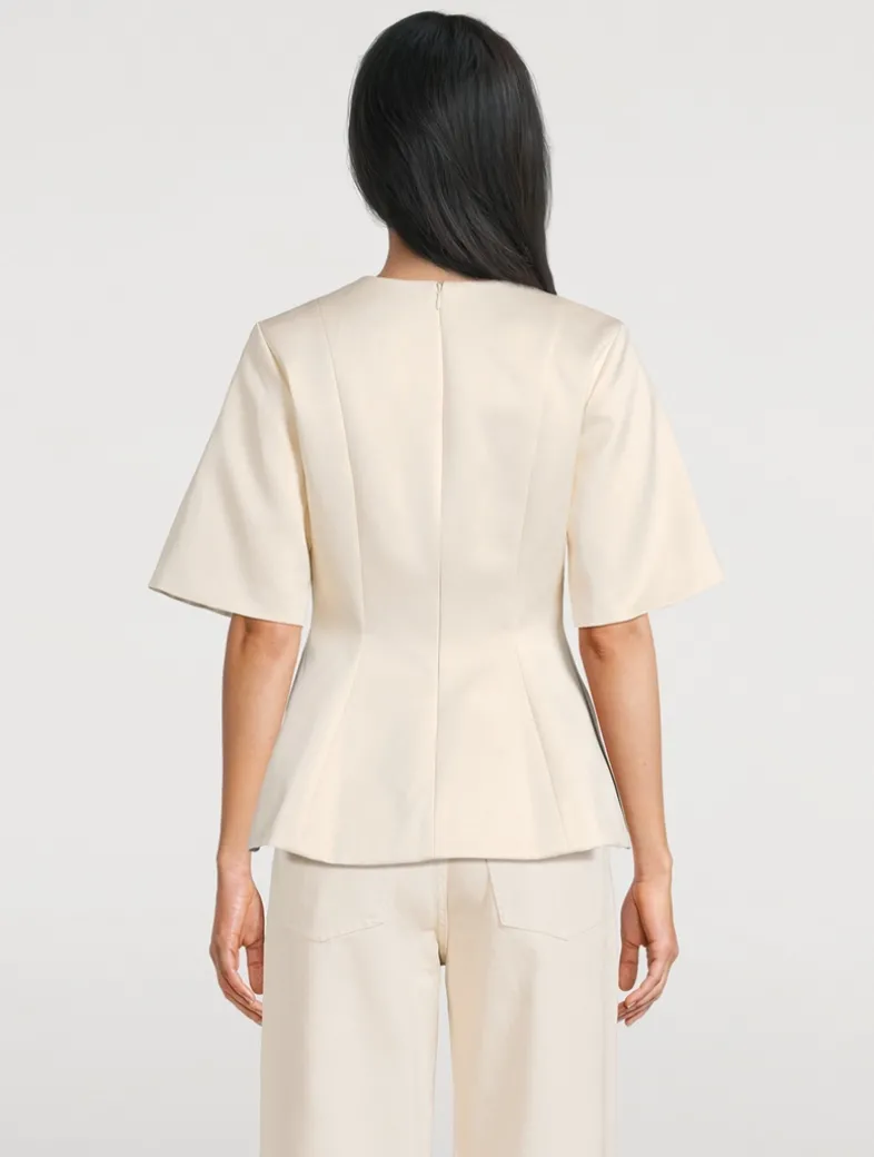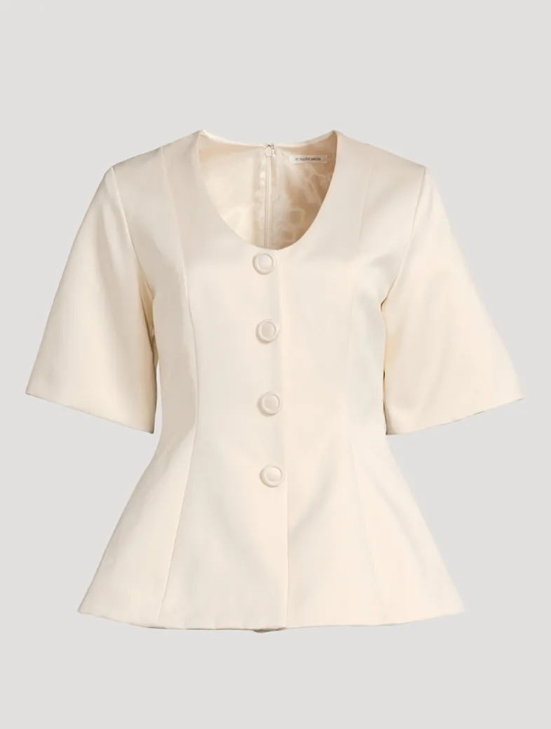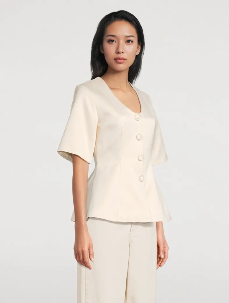 Polished and ladylike, the feminine design of this short-sleeve blouse has an accentuated waist, a faux button closure, and a deep neckline.