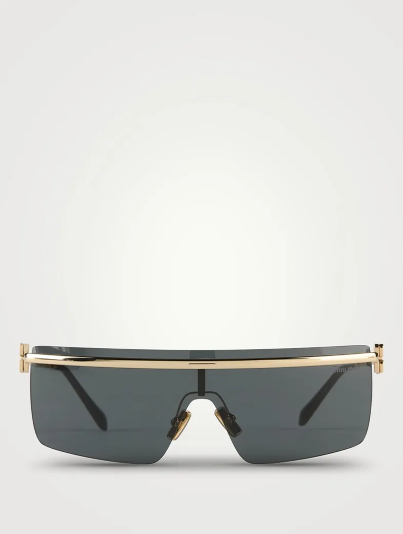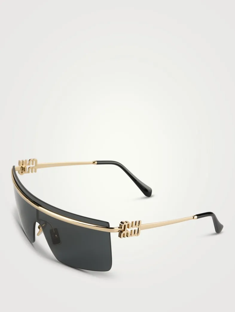 Designed with an oversized shield silhouette, these metal sunglasses are emphasized by the thin metal rims and new vertical Miu Miu logo integrated into the hinge of the straight temples.