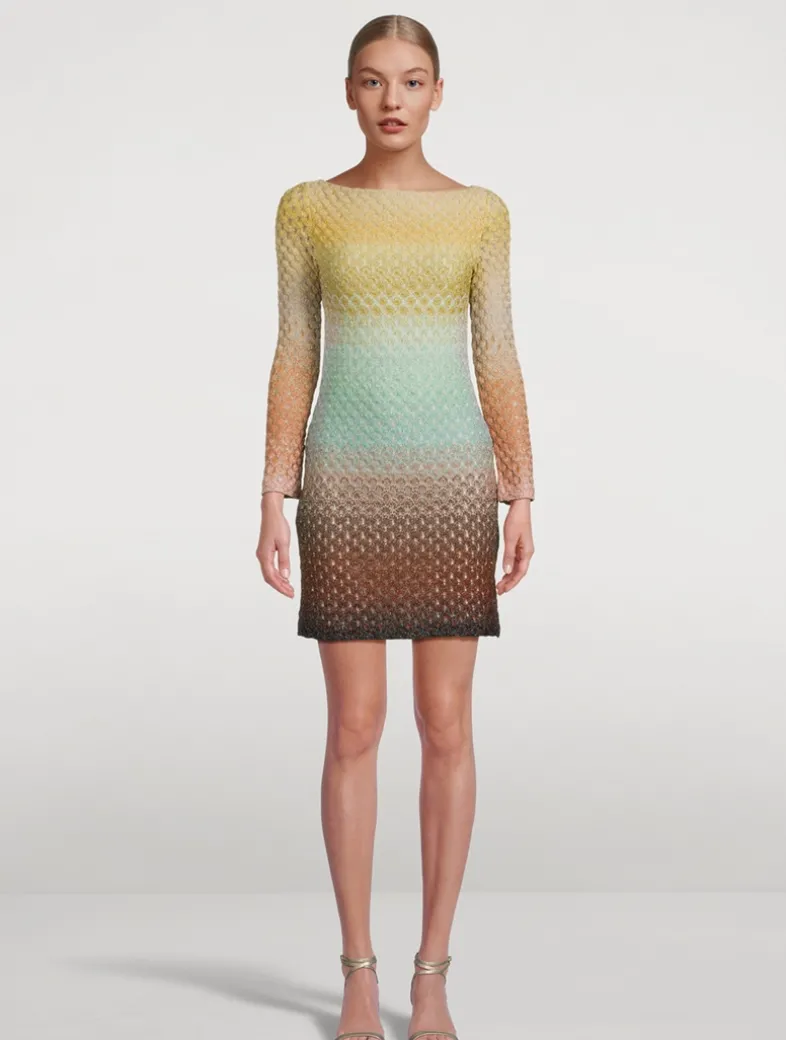 A masterpiece of balance between structure and lightness, this viscose and lamé mini dress with dégradé lacework is designed with a bateau neckline and long sleeves. Cut to a curve-hugging silhouette with a hidden zipper closure.