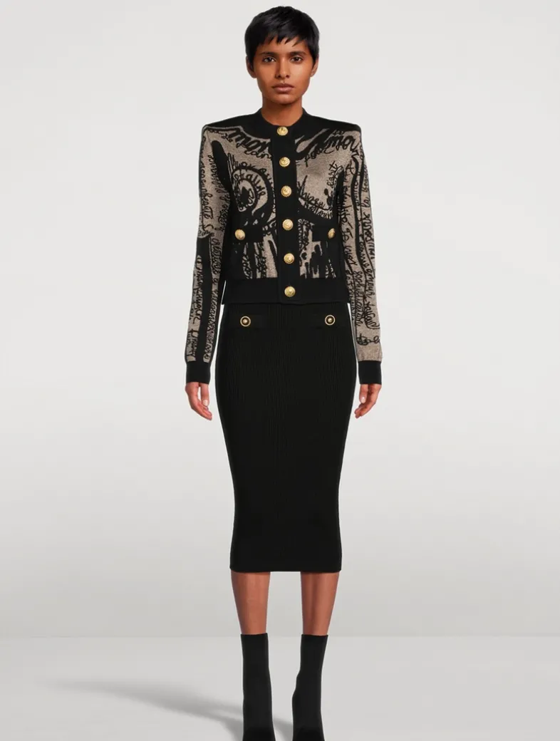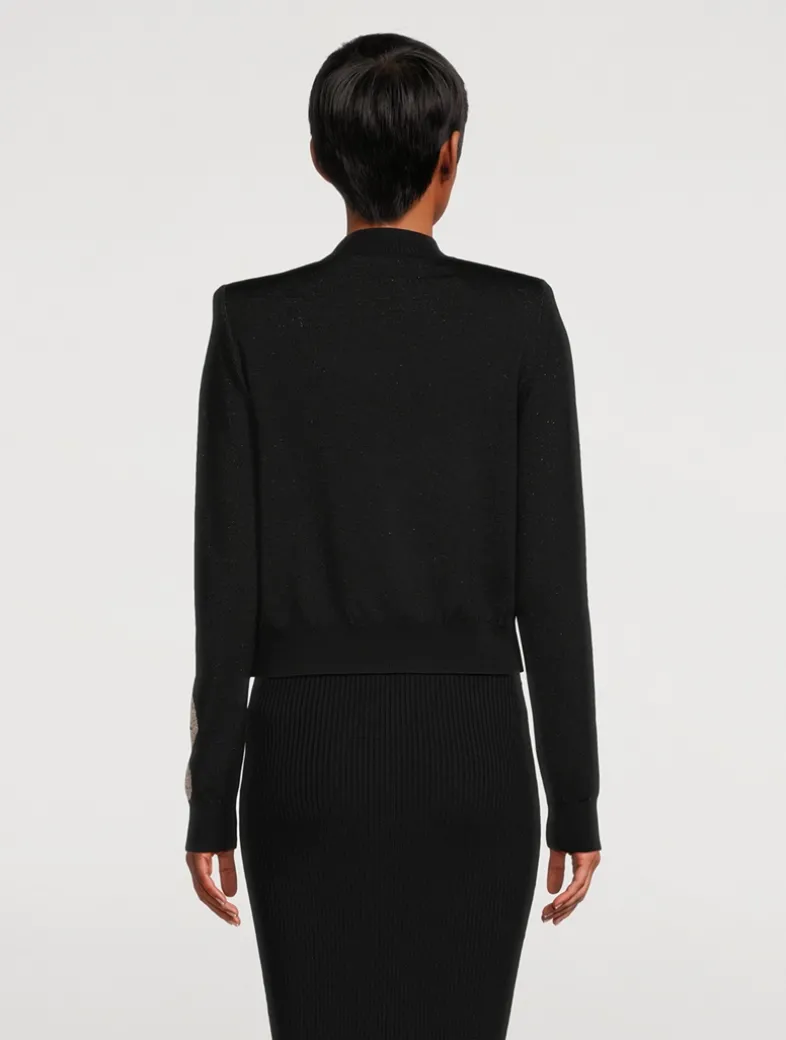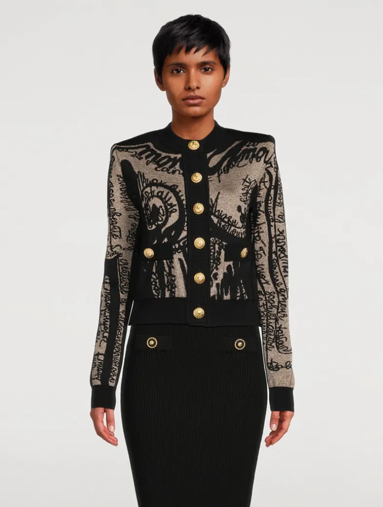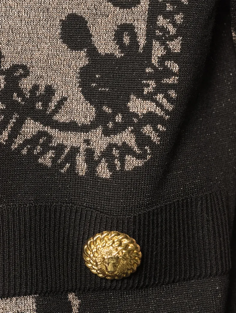 Knit from a wool blend with shimmering metallic threads, this sweater has a graphic jacquard motif and solid ribbed trim. The slim-fit design has a crew neckline, padded shoulders, and long sleeves. Finished with embossed buttons at the placket and pockets.