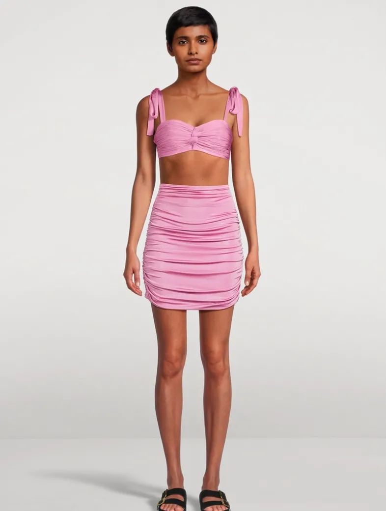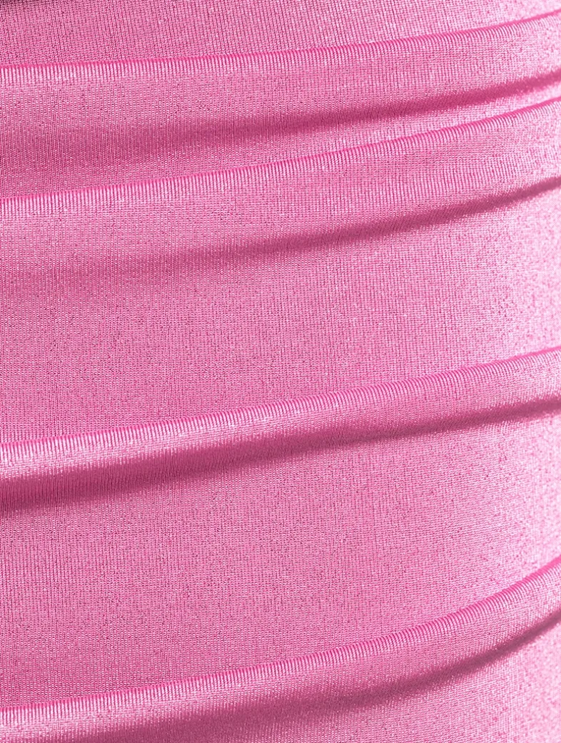This high-rise mini skirt is made from a metallic jersey fabric with ruched detailing.