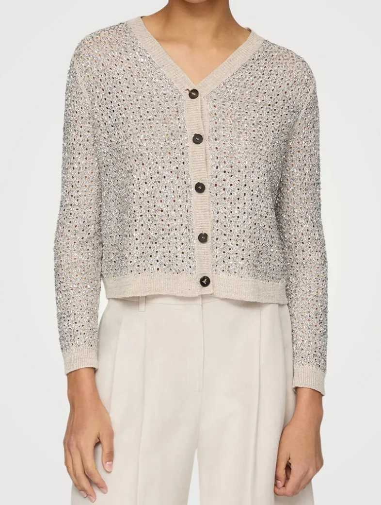This V-neck cardigan is crafted from Italian linen and silk in an intricate pointelle knit, accented with metallic stitchwork for subtle shine. The relaxed shape extends into slim long sleeves and fastens with contrast buttons down the front.