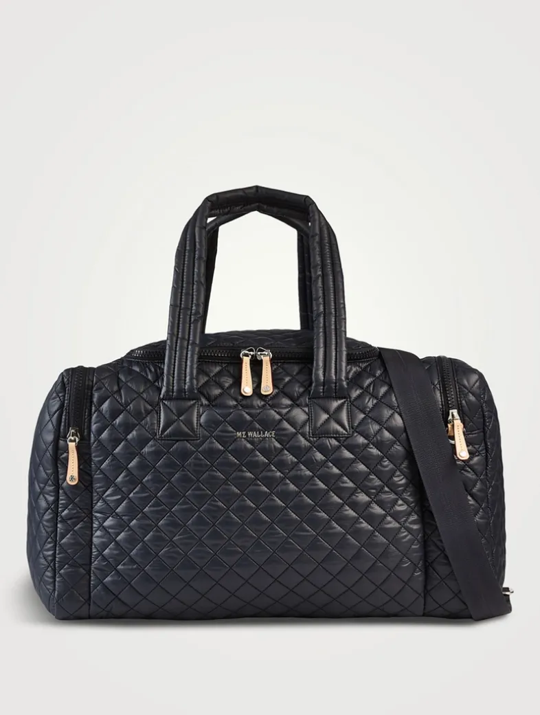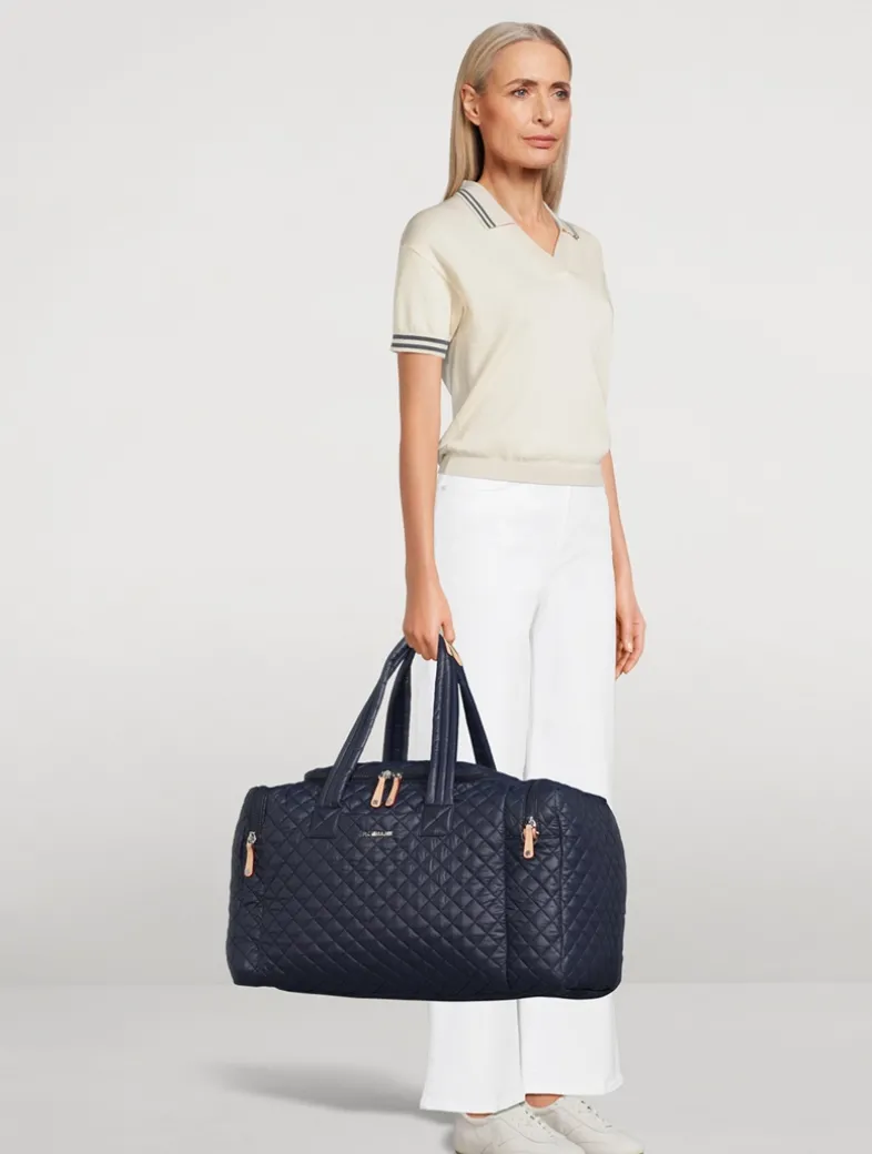 This utilitarian weekender is crafted from quilted nylon topped with reinforced padded handles and featuring a detachable and adjustable crossbody strap. It has four exterior pockets and a luggage sleeve, while the interior has six pockets, three detachable pouches, a phone pockets, and a key ring strap.