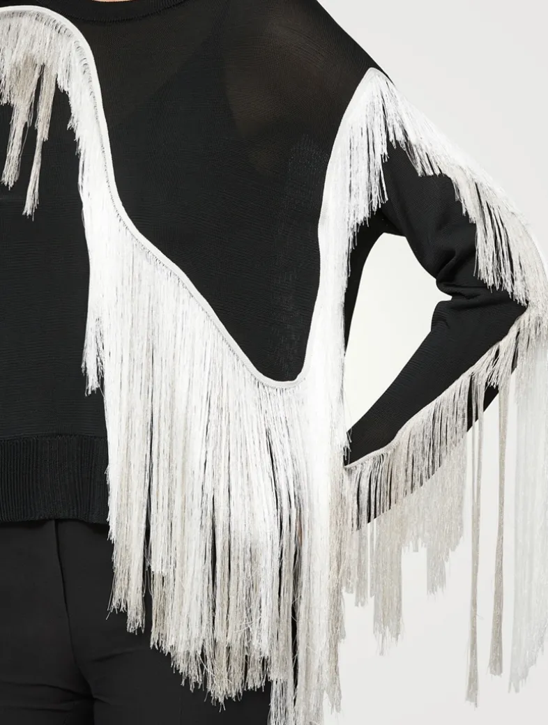 The collection meticulously translates the freeform gestures and timeless rituals of life drawing into wearable works of art. This standout sweater features two-tone, elongated fringing, hand-cut and draped on the sleeves and body. Crafted from fine viscose yarns in lightweight, semi-sheer knit, the relaxed shape is balanced by drop shoulders and wide ribbed trim.