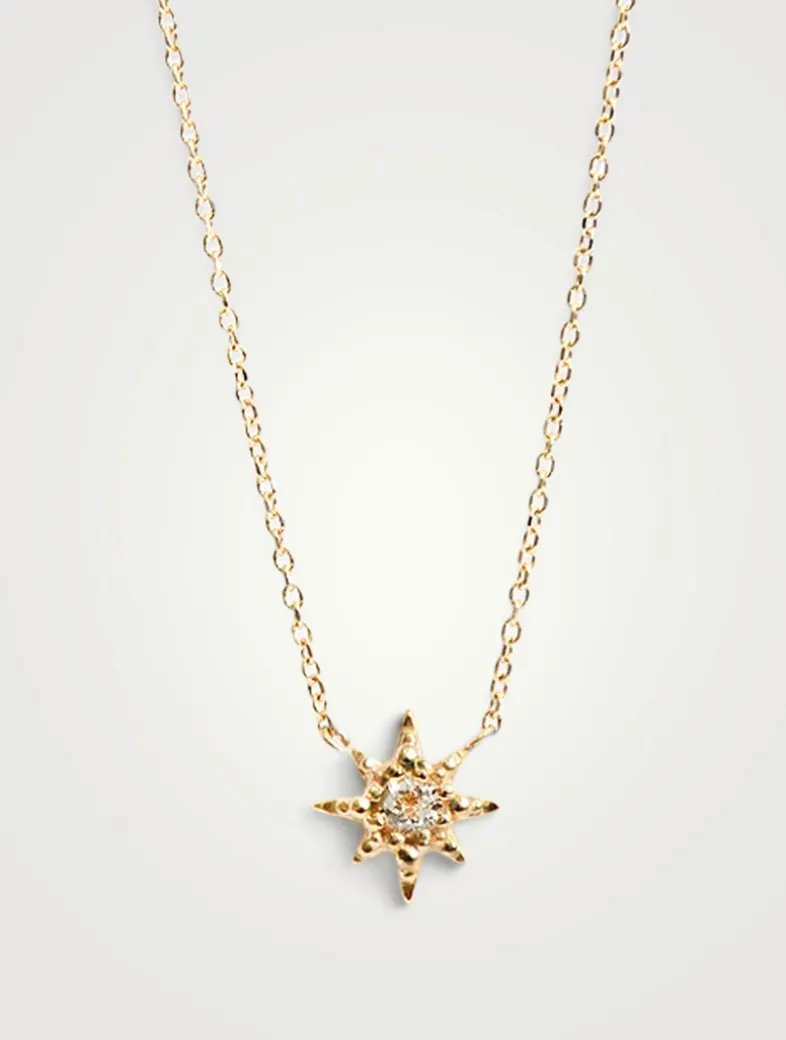 Inspired by both Southwestern and Art Deco influences, the Aztec collection showcases spikes, trillion-cut gemstones and starburst motifs. Delicately soldered between a thin chain is a micro starburst pendant encrusted with gemstones.