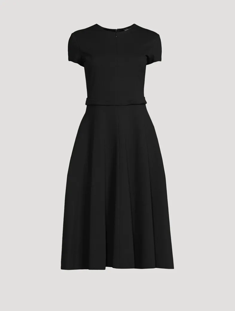 This short-sleeved dress with a rounded neckline and half-zip opening, is made from Milano-stitch fabric, a cozy, stretchy fabric that can be dressed up or down.