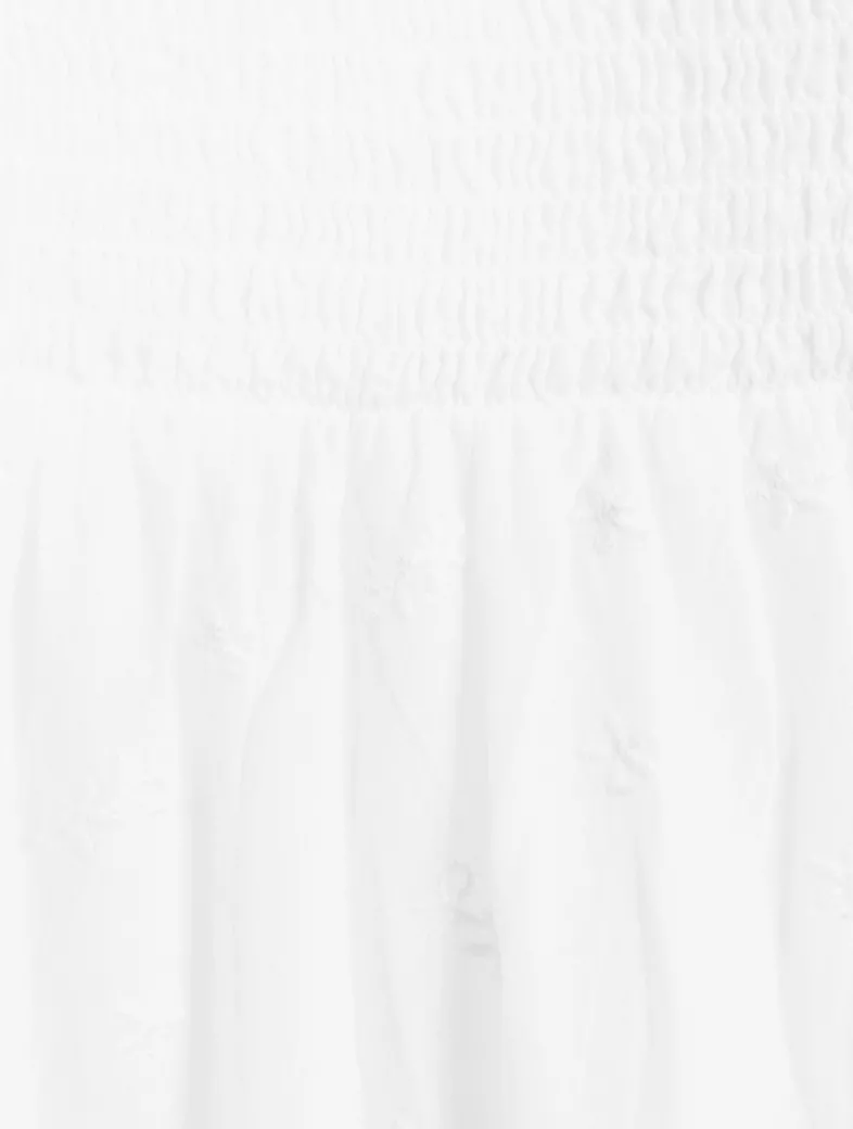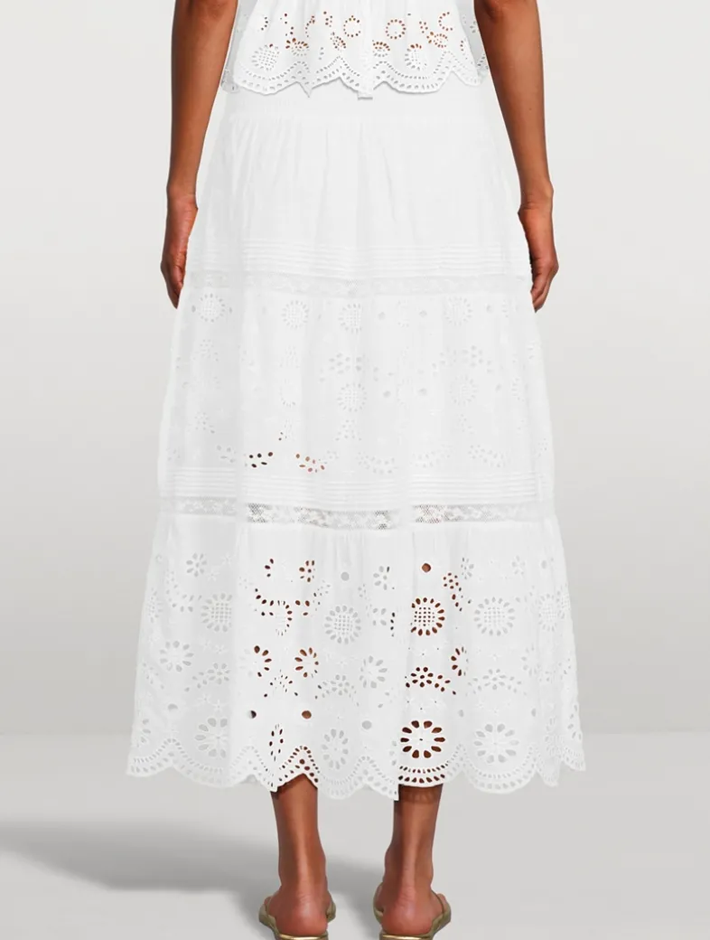 This cotton maxi skirt arrives with a beautiful medley of custom-made, large-scale scallop floral eyelet details mixed with smaller eyelets. The A-line skirt features smocking at the waist for elastication and comfort and a straight silhouette that releases into a fuller, eyelet skirt.