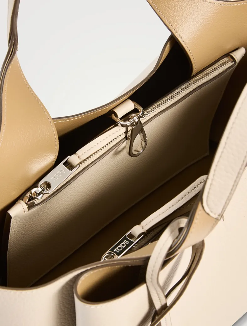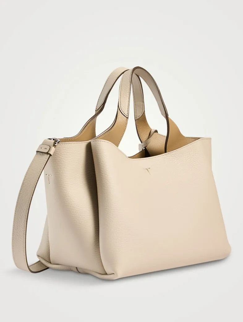 Crafted in soft exposed grain leather, with Tod’s logo stamped on the front, this bag has flat handles and an adjustable, removable shoulder strap. The interior comes with three compartments separated by zipped central pockets.
