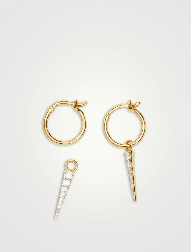 A distinctive addition to your ear stack. Suspended from small pared back hoops, these spike drop charms stand out with pavé detailing. Wear solo, contrast with a plain stud for added impact or opt for the pavé spike earring set. Remove the charms to wear the hoops solo. The size of this earring is best for those with smaller lobes, or perfect for second or third piercings.