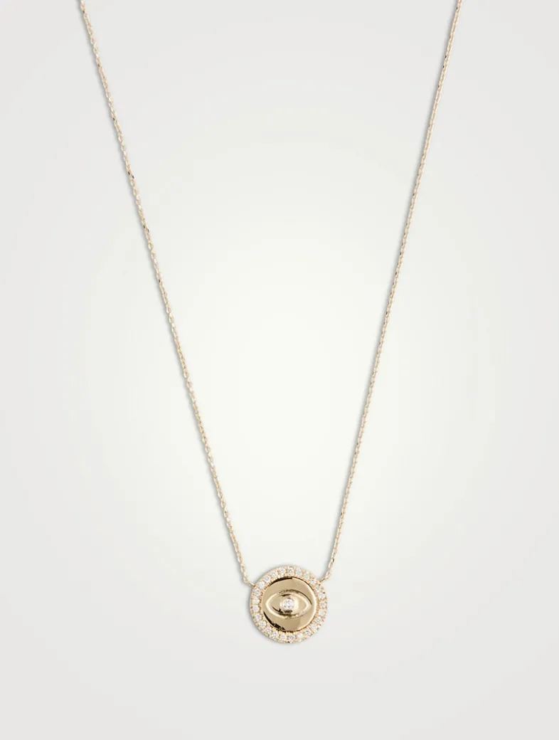 This dainty and elegant good luck piece features a gold round evil eye pendant set with a dazzling array of diamonds and soldered between a diamond cut chain.