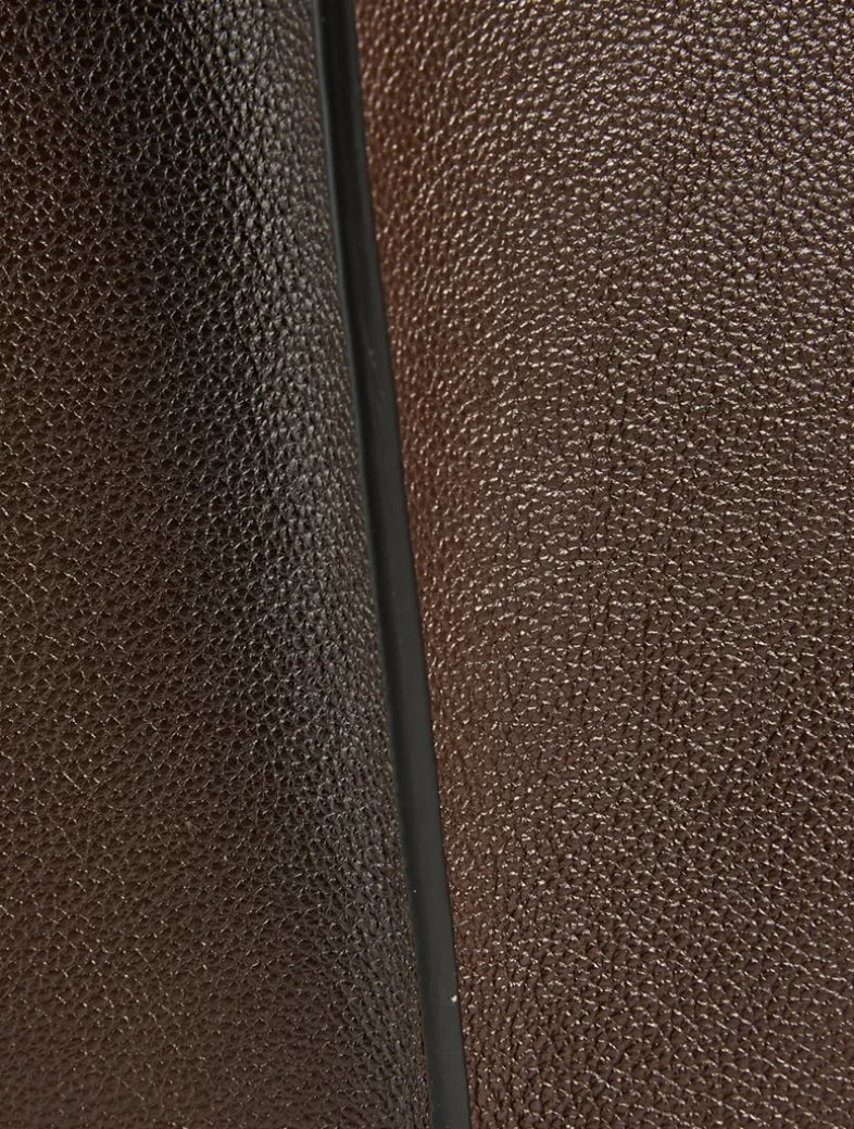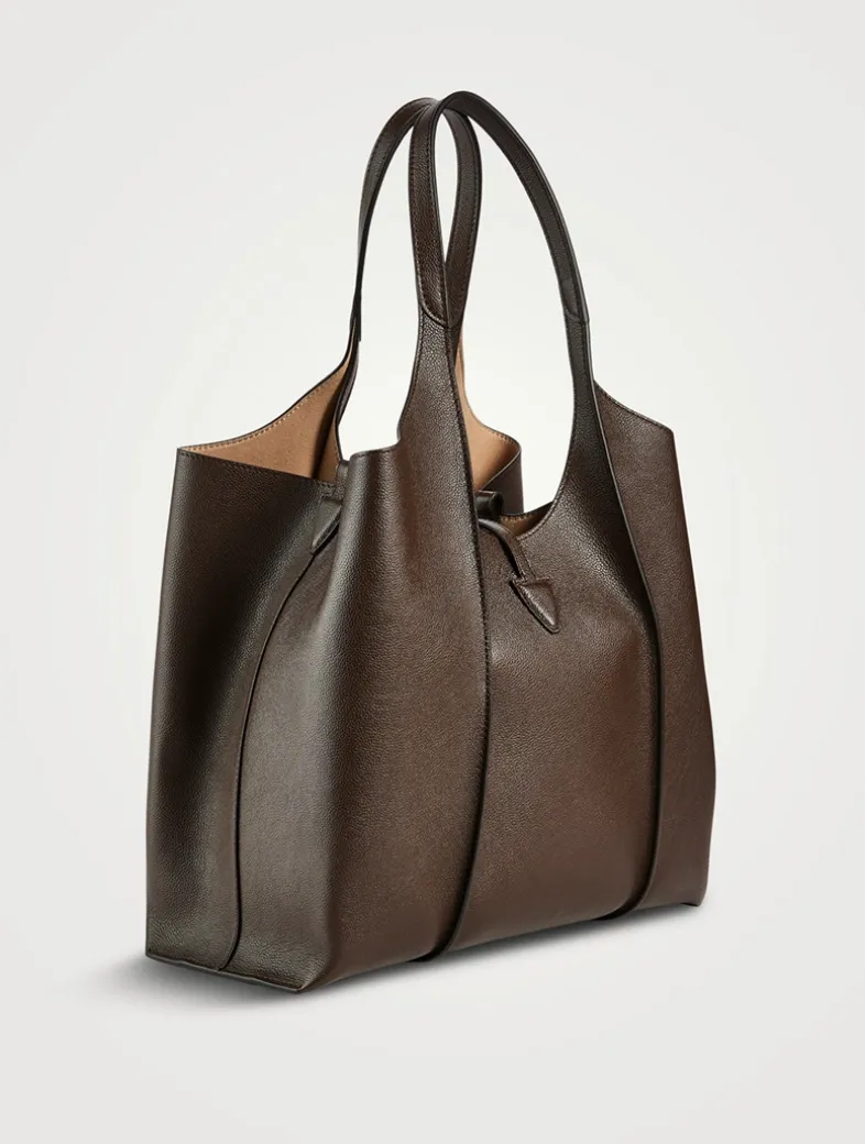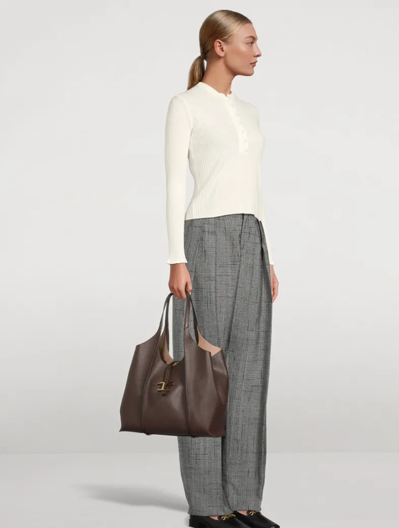 This shopping bag with flowing lines is crafted in hammered leather with ribbing and branded metal T Timeless pendant accessory. Two fixed handles, adjustable and removable shoulder strap, and a wide internal compartment with a removable pouch.