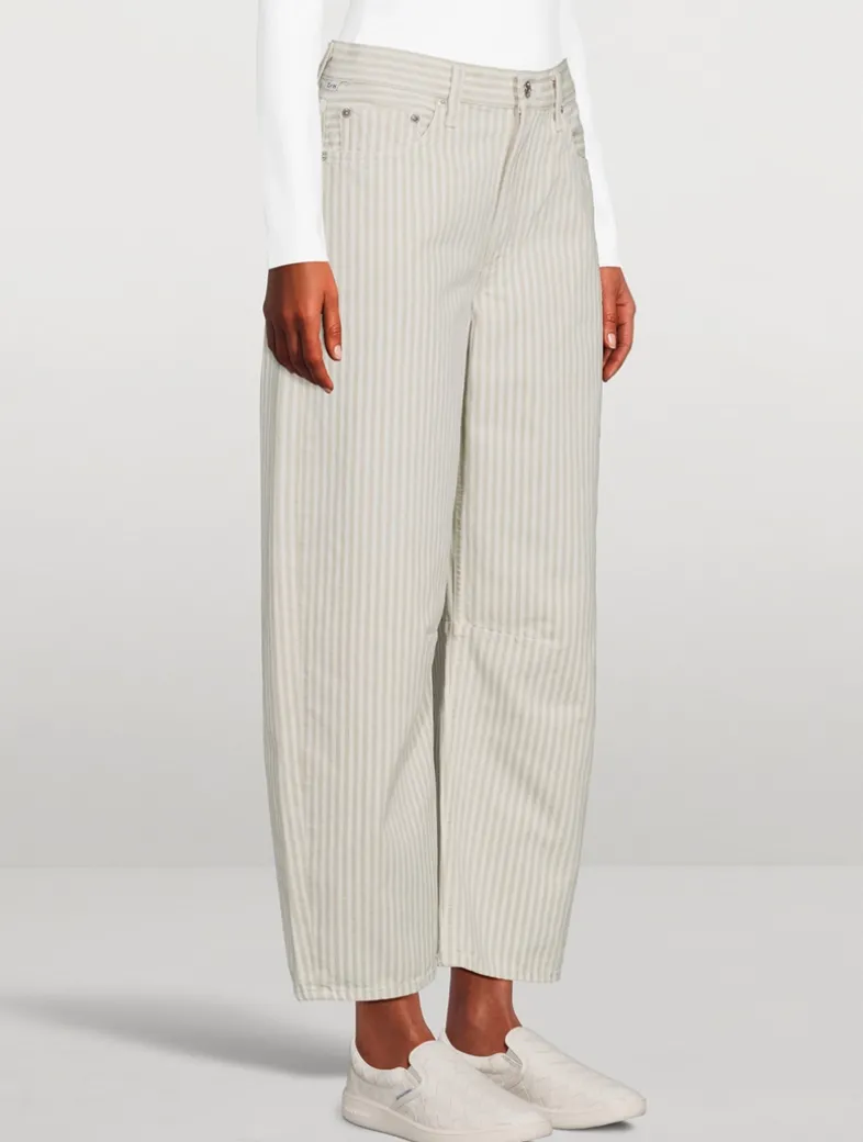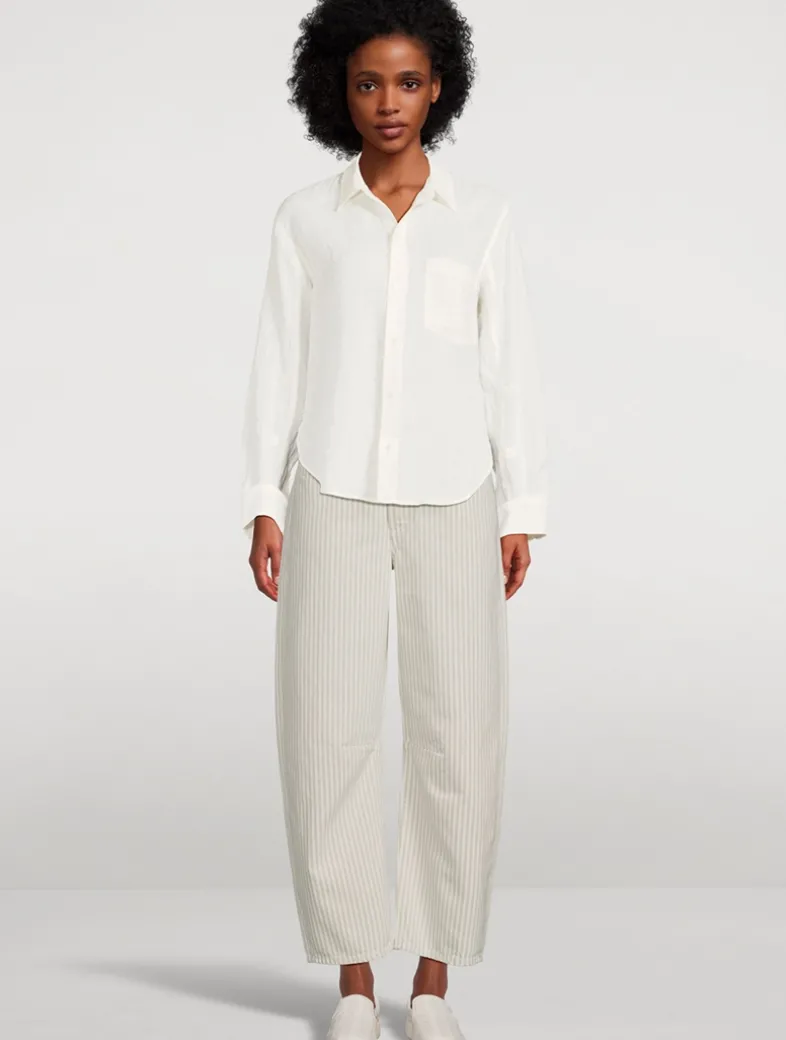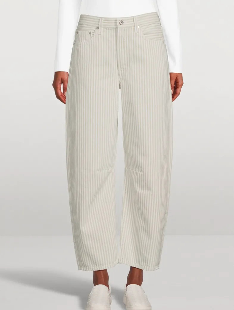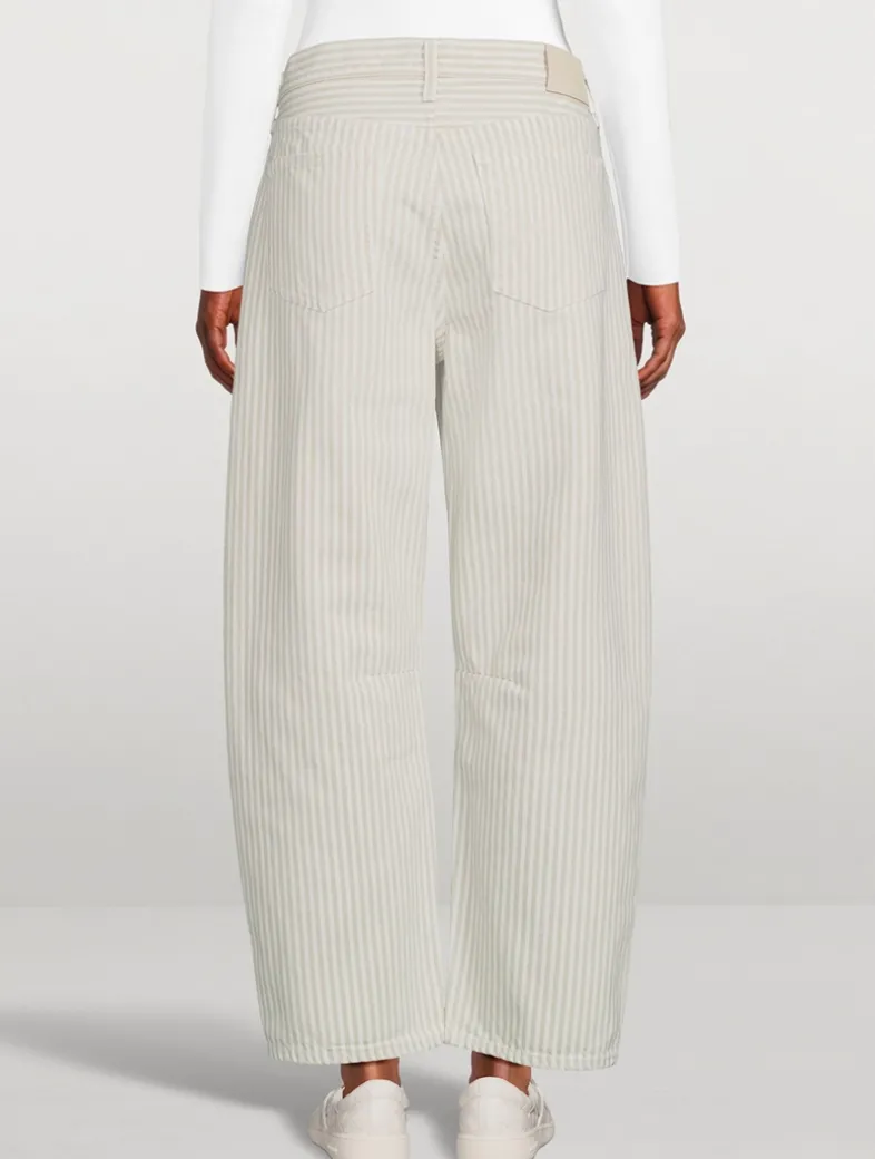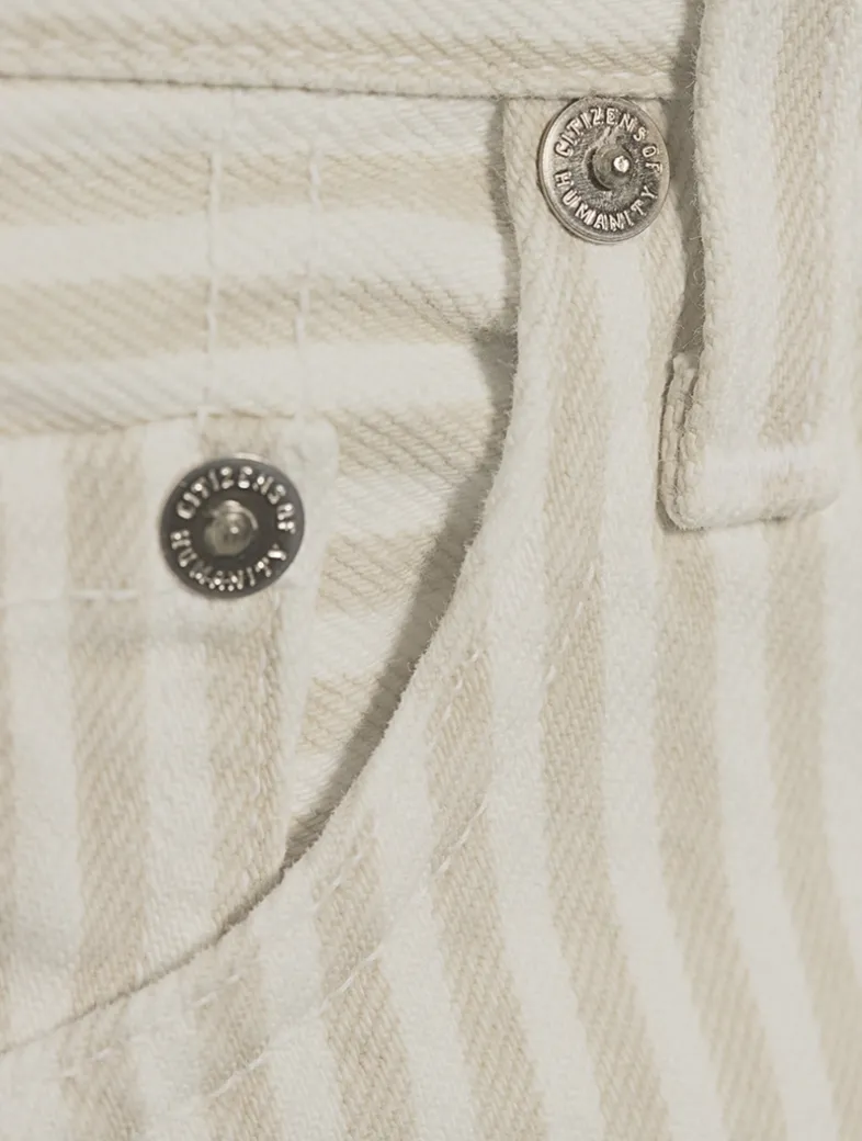 The Miro reworked jean has offers a slightly relaxed top block and a tapered take on the barrel-leg silhouette. Printed with stripes, it is craft from rigid, non-stretch cotton with a subtle drape for ease.