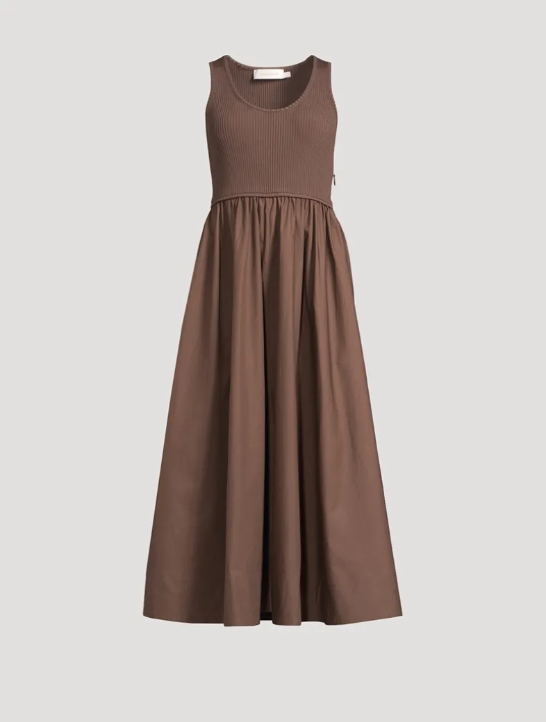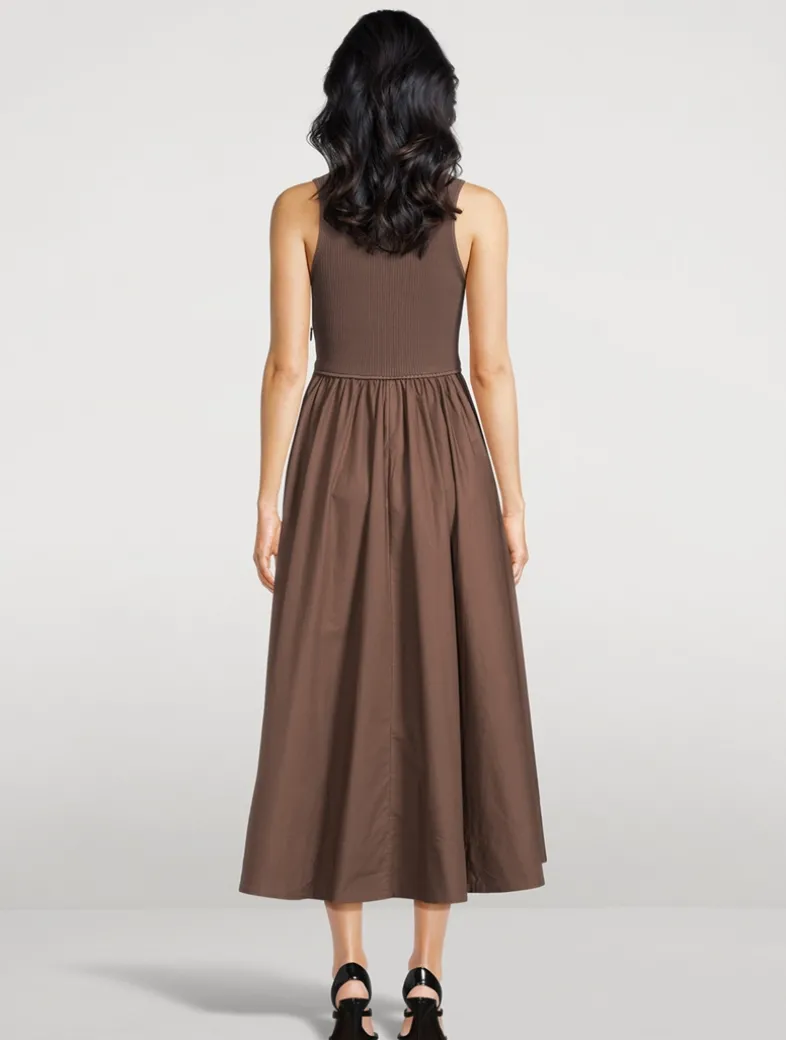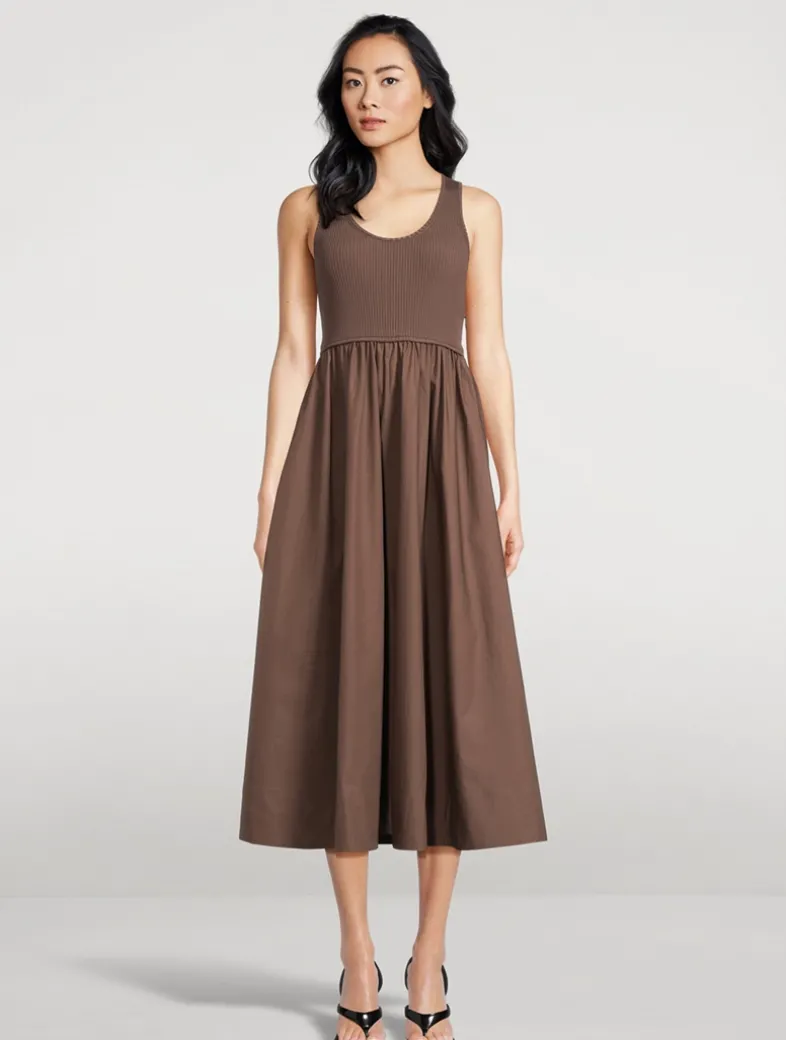 This monochrome midi dress pairs a fitted rib-knit bodice with a gathered, cotton poplin skirt. Finished with piping around the waist, it has a rounded neckline and a subtle racerback design.