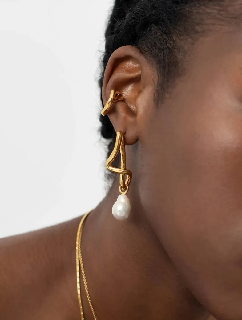 Iconic pearls for everyone. These asymmetric mismatched earrings feature an organic twist on the brand’s classic ovate hoop, with a single drop baroque pearl on one side and two on the other. A statement hoop inspired by music notes.