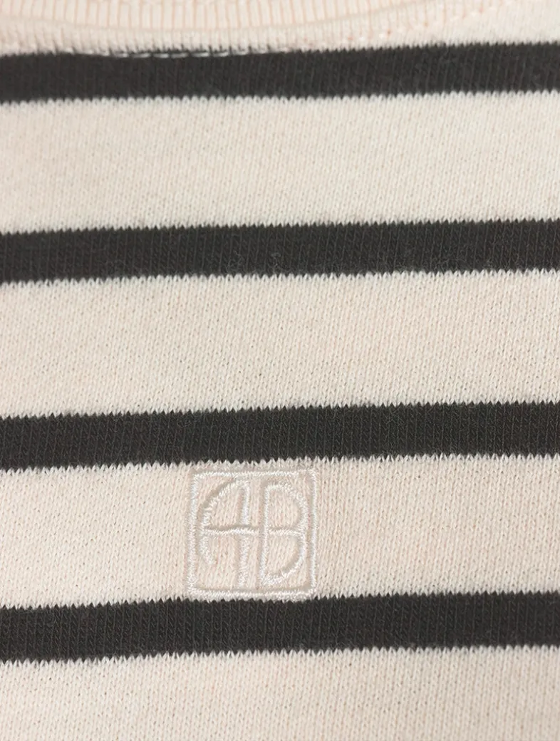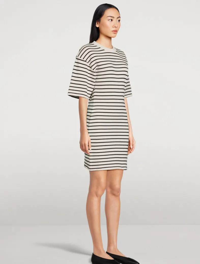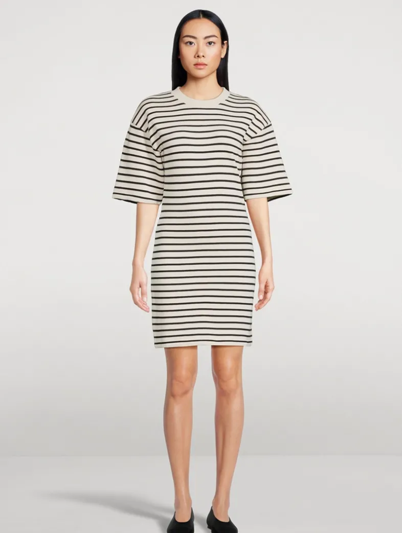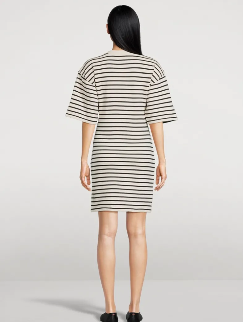 The Mona Dress is made from a midweight cotton-blend French terry fabrication with classic Breton stripes. Finished with removable shoulder pads to create an architectural look.