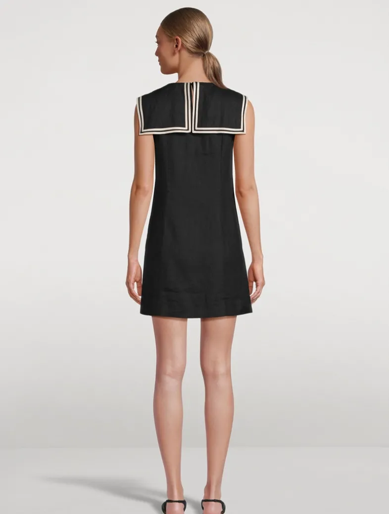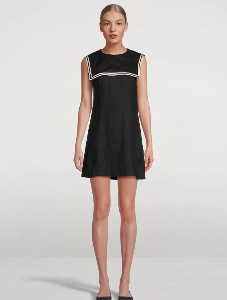 Tailored in a soft midweight linen, the Monroe Dress is a ‘60s-inspired mini-length shift dress. It features a body-skimming shift silhouette with an invisible side zipper and a wide square sailor-style collar trimmed with contrast satin piping. A single self-covered button with a keyhole detail fastens at the back of the neck.