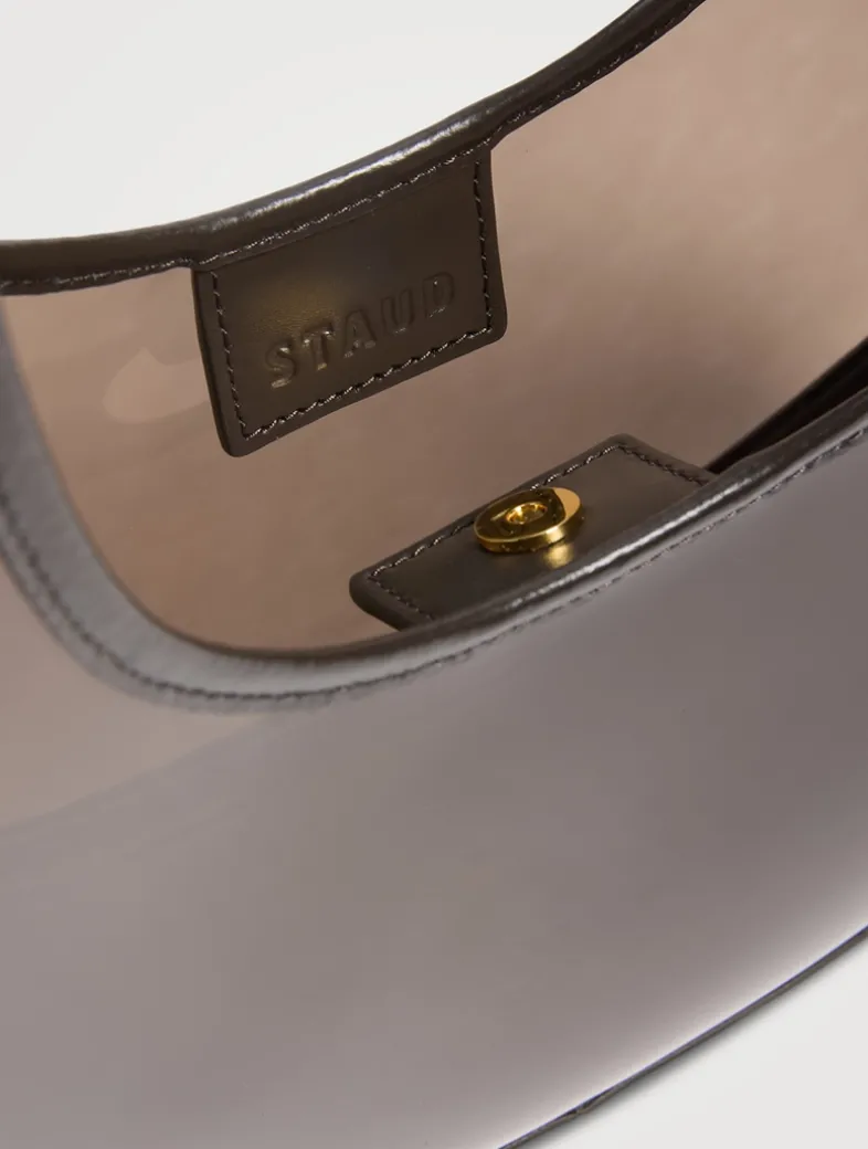 The Moon Bag features a curved handle with a removable STAUD-embossed accent. Designed in a crescent moon shape with plush suede lining and a magnetic clasp closure to hold your essentials.