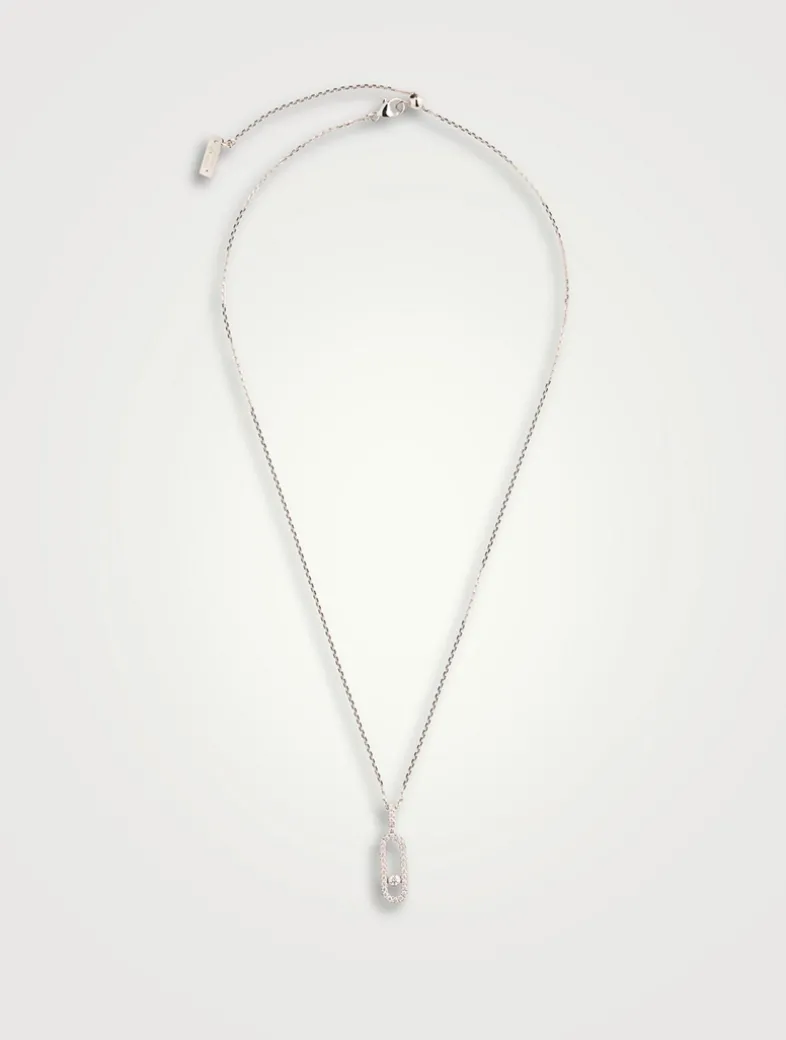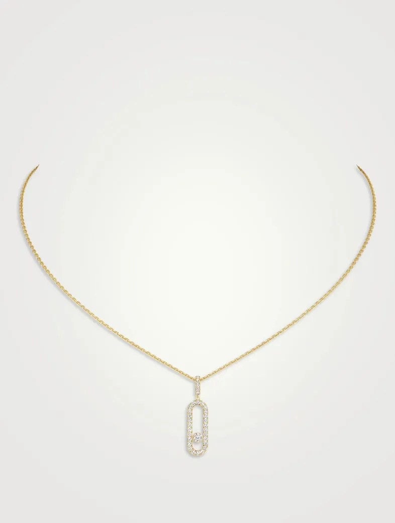 Set with diamonds at the center, this 18k gold necklace features a playful mobile diamond, and a sliding clasp making it adjustable.