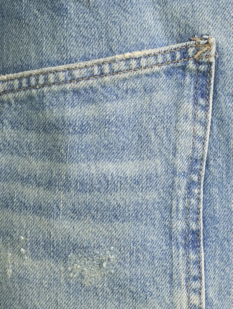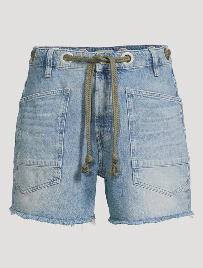 A cut-off version of the barrel-leg Moxie, presented here with faded detailing, oversized patch pockets, and a contrast drawstring waist. The have a low-slung, slouchy fit with raw-edge hems.