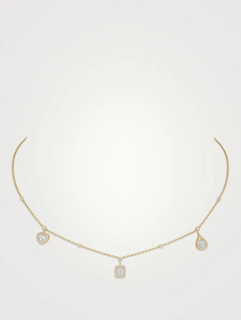 With three diamond drop pendants, the My Twin Trio diamond necklace alternates heart, emerald, and pear-cut diamonds.