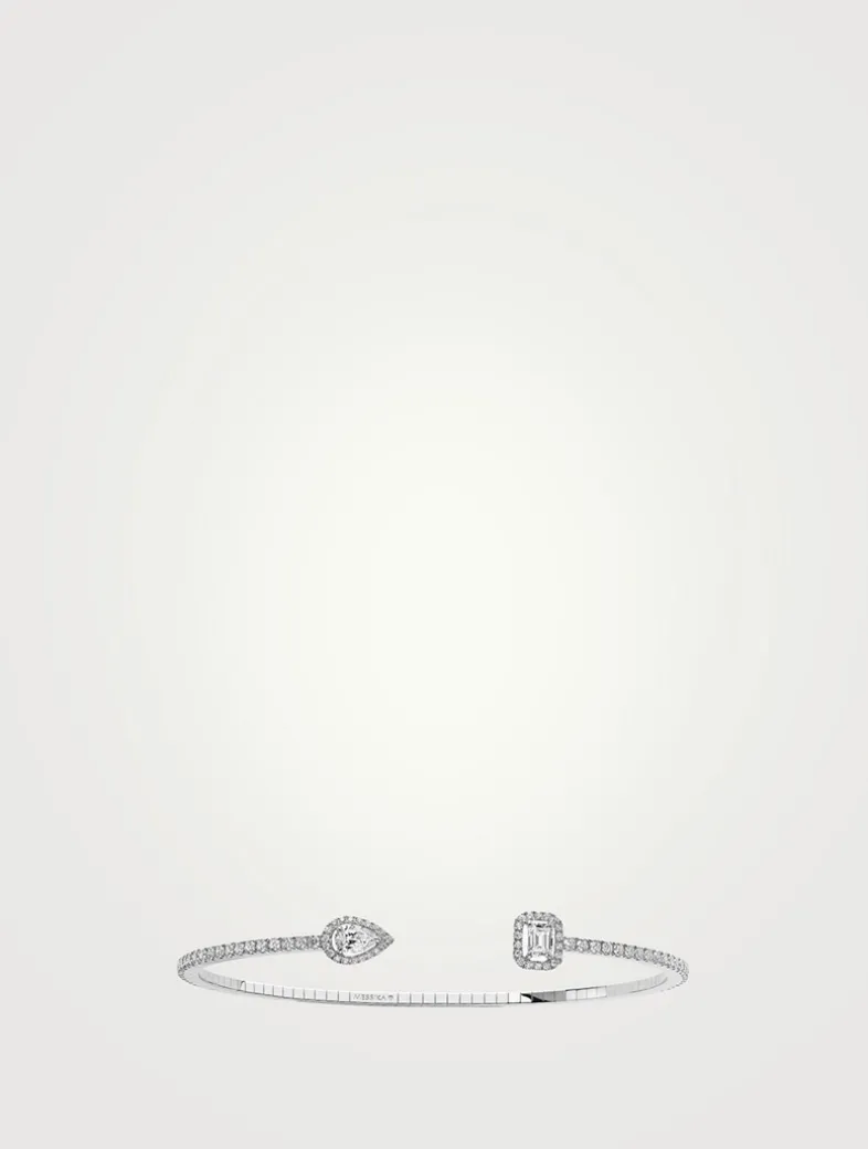 This My Twin Toi & Moi Skinny bracelet by Messika features 0.15 ct of F/VS quality pear and emerald-cut diamonds in white gold, enhanced by brilliant-cut accents and an invisible gold nano-spring system for comfort and flexibility.