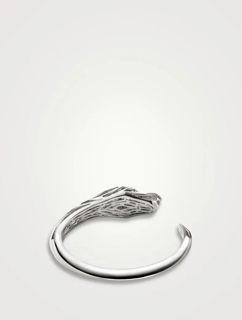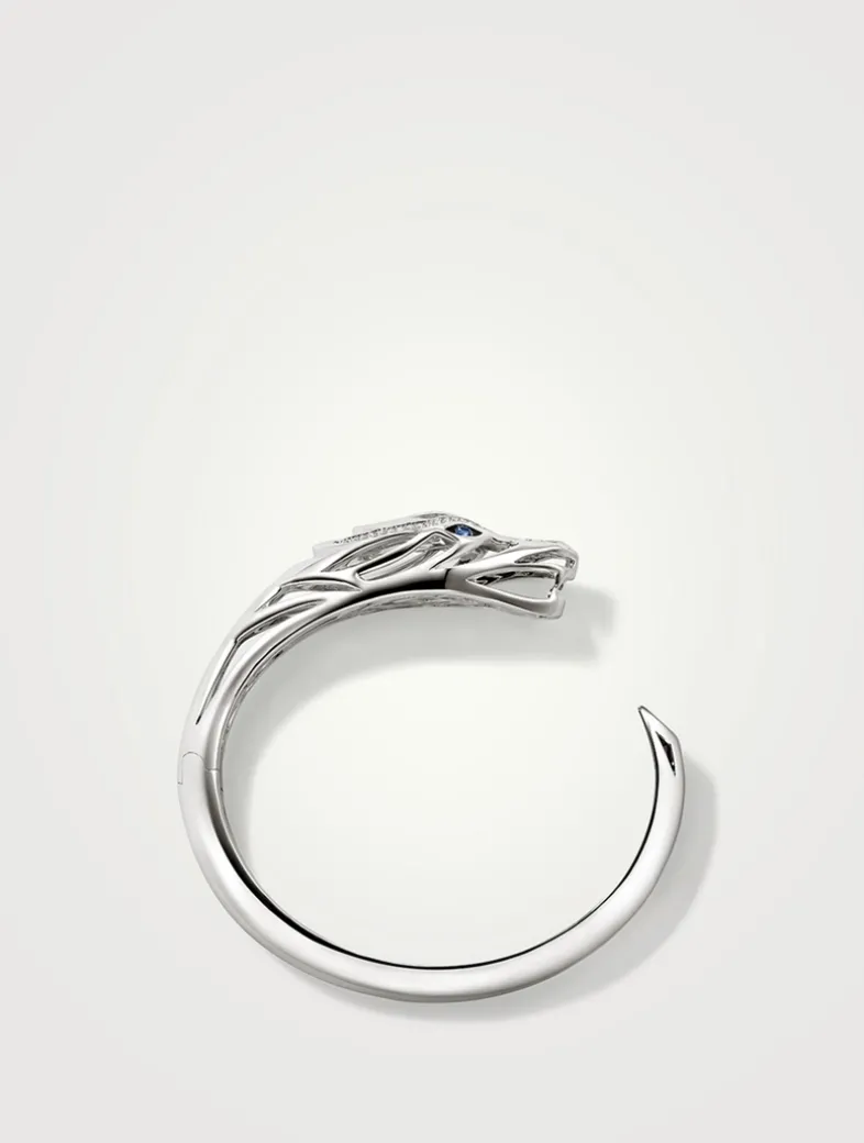 A hinged cuff featuring the hand-carved Naga dragon—a legendary symbol of love, protection, and prosperity. Artisan handcrafted in sterling silver with white diamonds and blue sapphires.