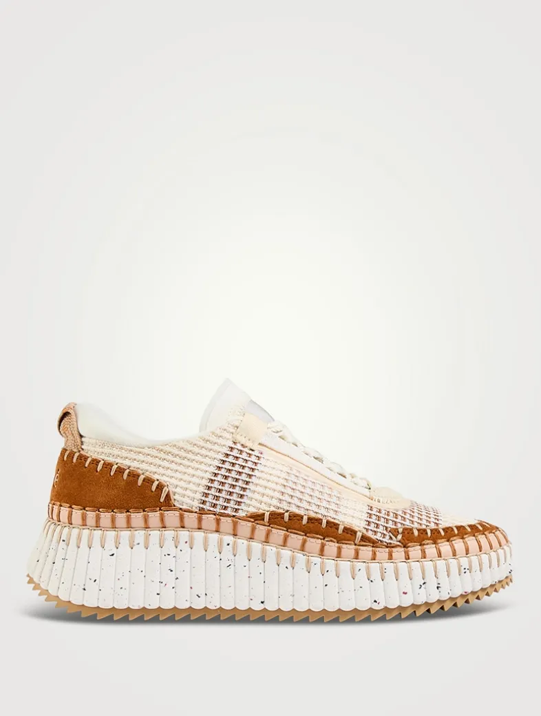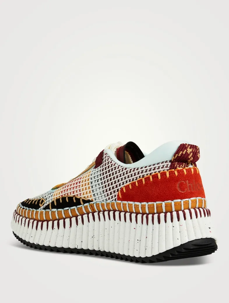 Rooted in the Maison’s commitment to sustainability, the eco-designed Nama sneaker is crafted from a rich mix of materials with 40% of its weight made up of recycled debris. The bold, lightweight structure features a hand-stitched mesh upper, showcasing authentic Chloé craftsmanship. Set on a ridged sole, this sneaker is ultra-comfortable with a cool, sporty aesthetic. The Chloé logo at the back adds a signature touch.