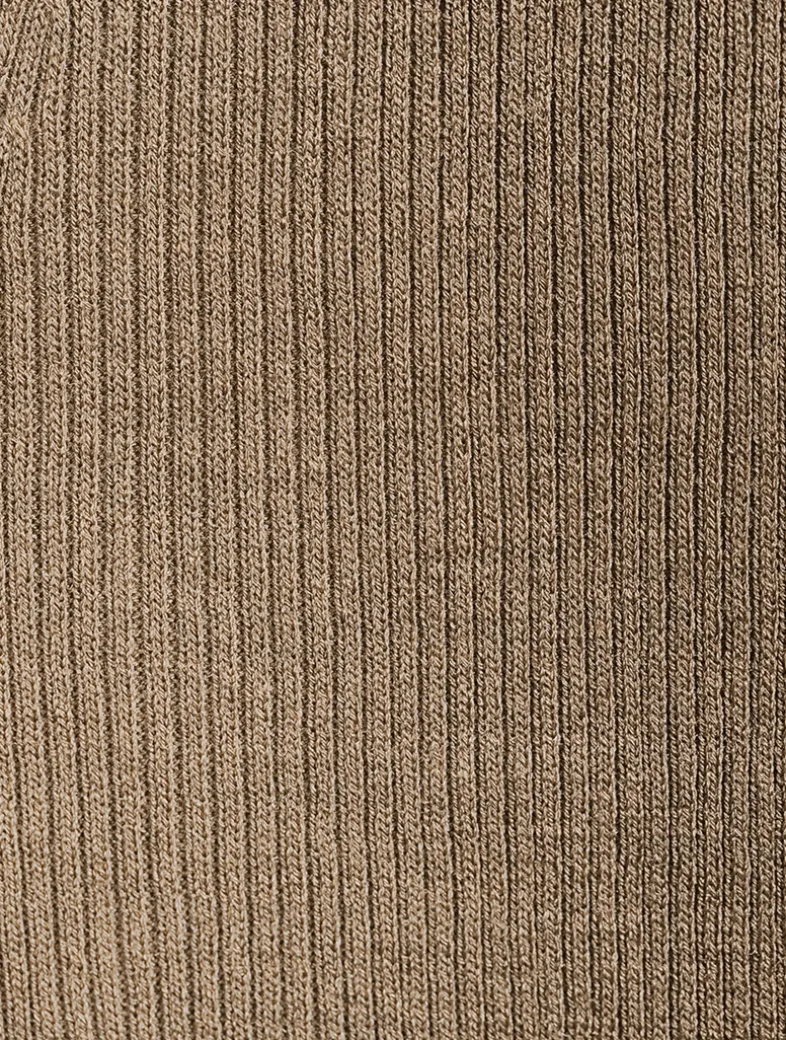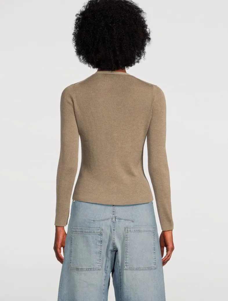 Knit from a lightweight, fine-gauge ribbed silk, this long-sleeve sweater has horn buttons at the placket. It is fully fashioned along the arm hole and shoulder.