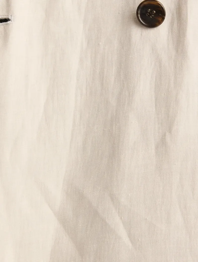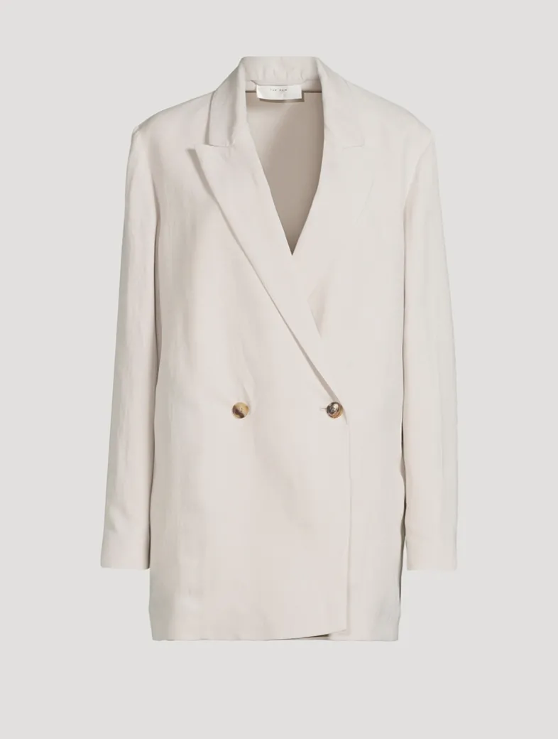 Cut to an oversized silhouette, this double-breasted jacket is made from a woven silk and linen blend. The topper is designed with peaked lapels, side seam pockets, and a pair of horn buttons at the placket.