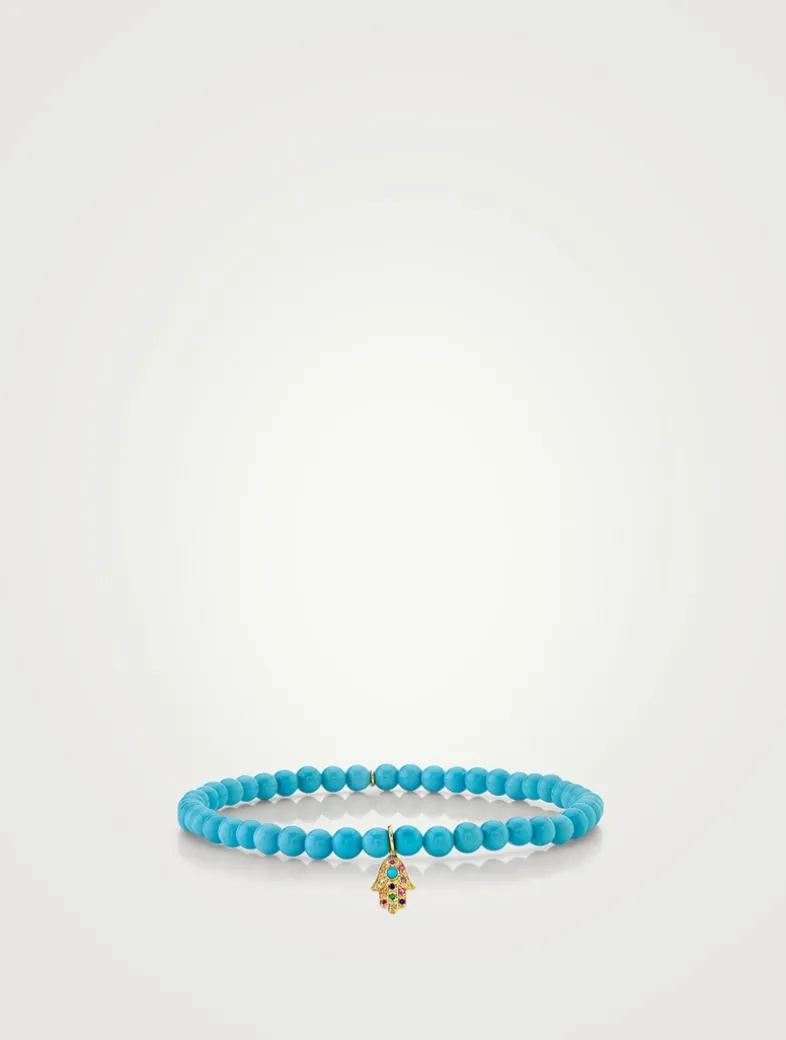 Strung with turquoise beads, this bracelet features a 14k yellow gold Hamsa charm with rainbow stones. All SYDNEY EVAN beaded bracelets are strung on a stretch cord along with their 14k gold SE logo charm.