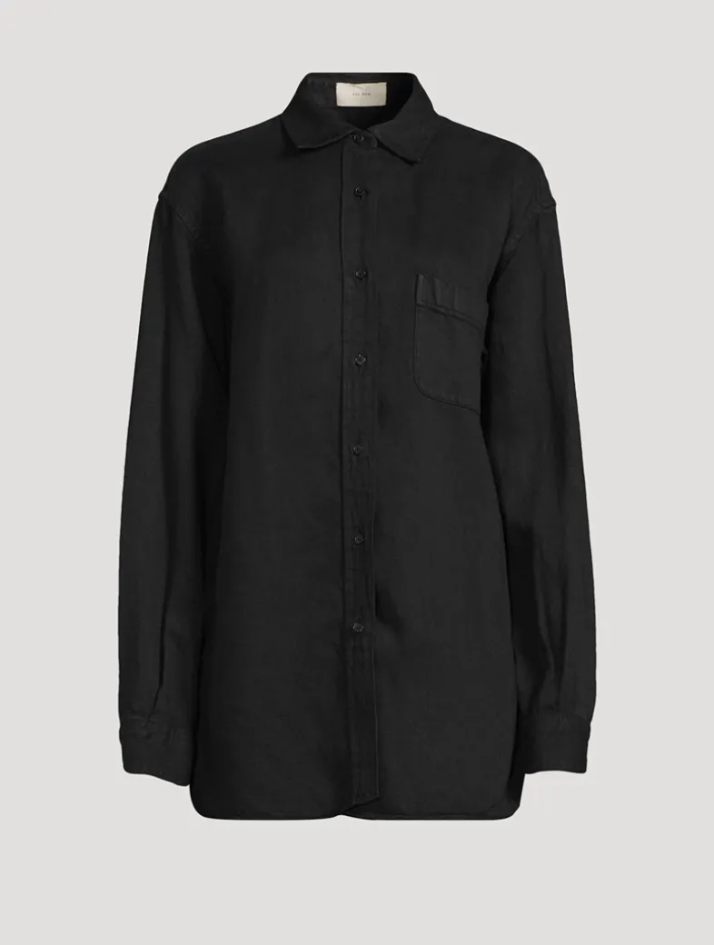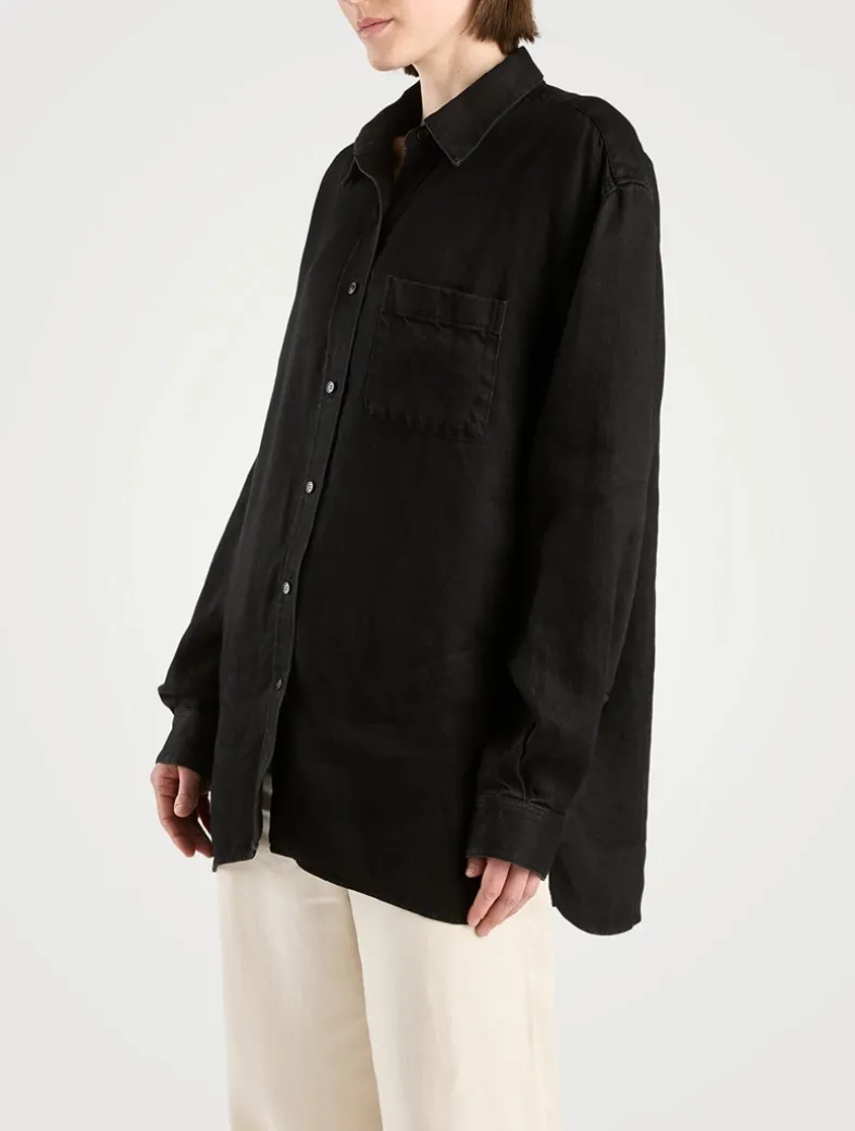 Made in Italy, this relaxed button-up shirt is crafted in soft linen denim. The long-sleeve top is designed with a front patch pocket, slim back yoke with side pleats, and exposed front placket with mother-of-pearl buttons.