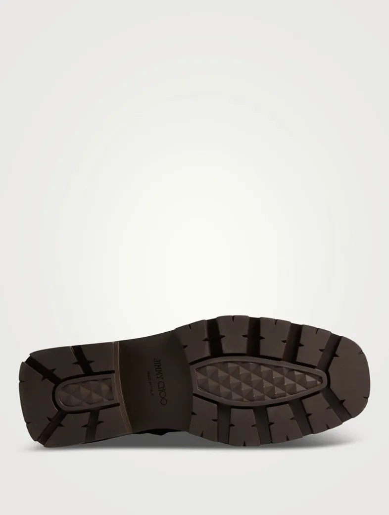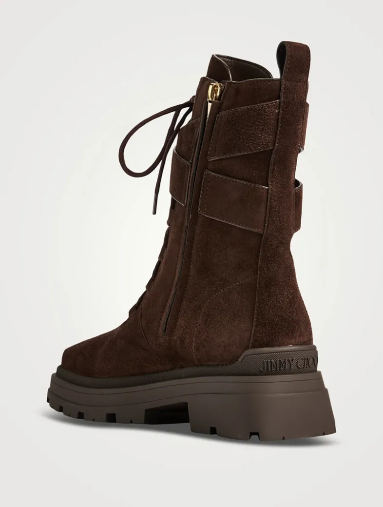 Crafted from soft suede, the Noemi boot elevates a timeless combat style with a pearl-adorned strap. Designed with a square toe and bold treaded sole.