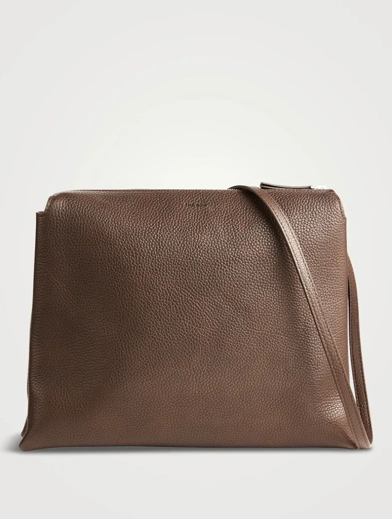 Named for its dual compartments, this softly structured shoulder bag is crafted in grained leather with a seamless construction, adjustable crossbody strap, and zip-top closure.