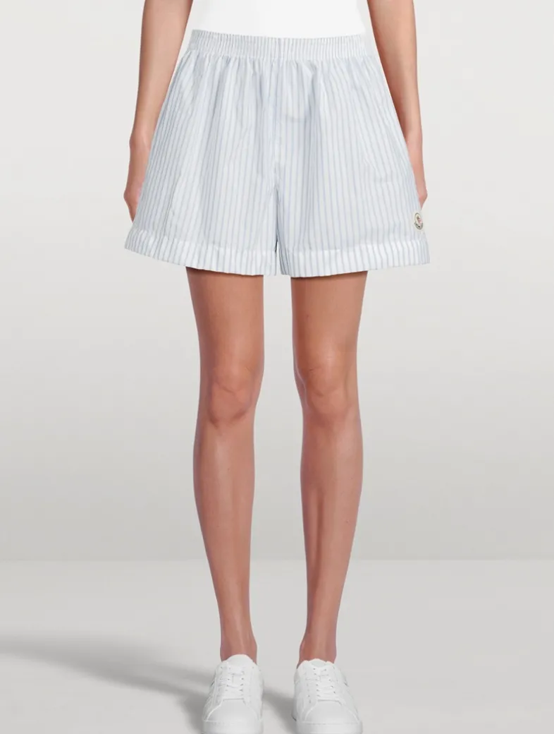 Characterized by a classic striped pattern, these casual shorts are made from 100% nylon, and features an elasticated waistband, and Moncler logo patch at the front hem.