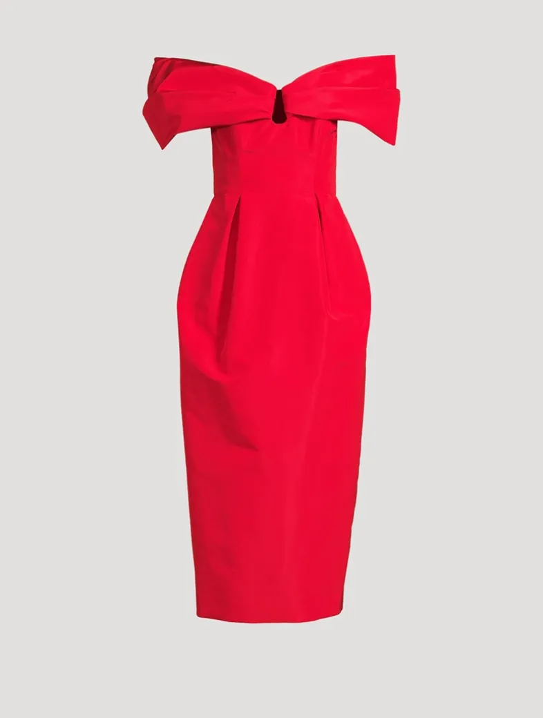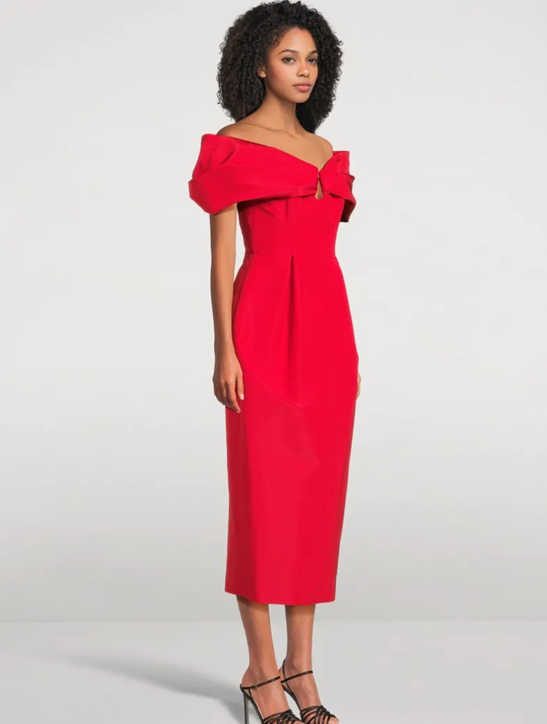This strapless silk faille dress features dramatically puffed shoulders and an alluring U-neckline. Pleating at the skirt emphasizes the tailored waist.