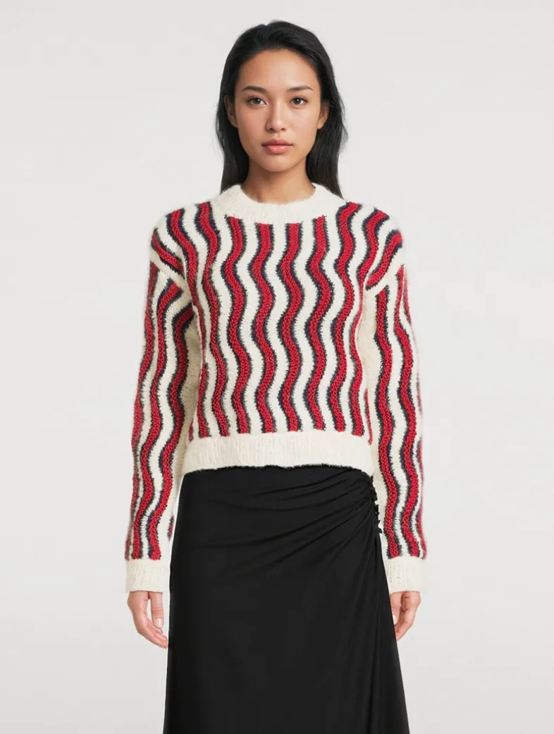 This semi-cropped sweater features a vibrant multicolour wave pattern and is handknit with care by skilled artisans in Peru.
