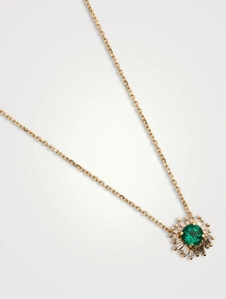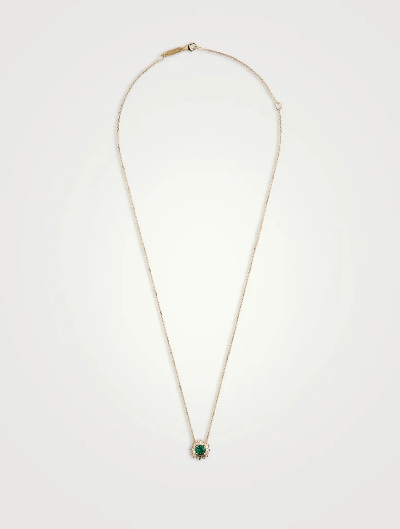 This adjustable chain necklace features a flower pendant with baguette-cut diamond petals and round emerald centre.