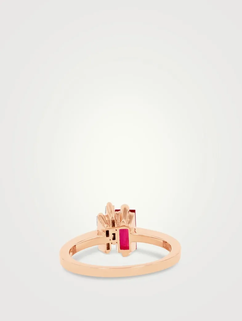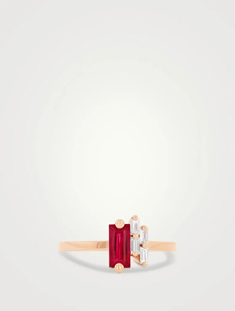 Crafted in 18k rose gold, this ring features a centre ruby offset by a cluster of baguette diamonds on one side. The slim and elegant profile of the stones keeps the modern setting looking smart.