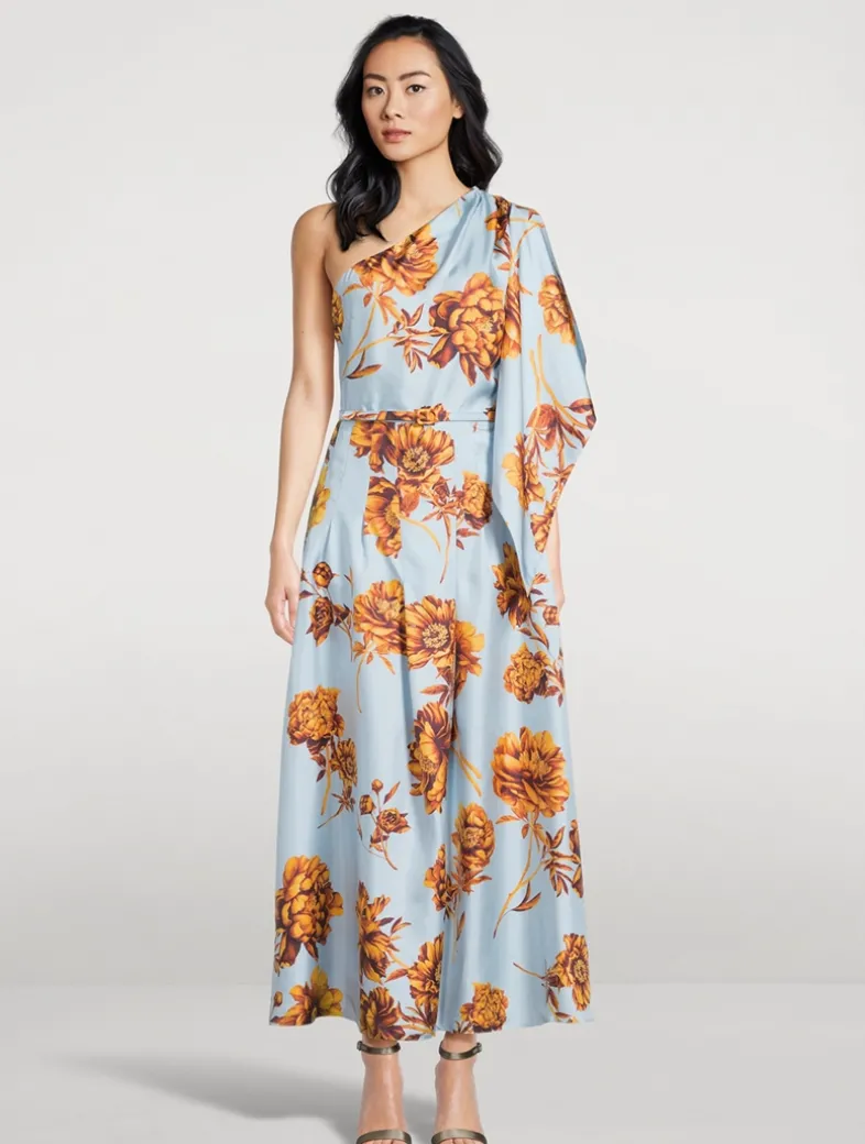 This silk twill midi dress features a classic one-shoulder silhouette with a softly draped detail that cascades from the shoulder for added movement. A self-belt defines the waist, bringing balance to the fluid lines of this romantic design.